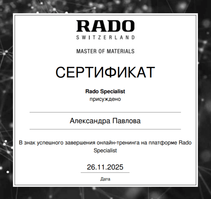 Наши консультанты проходят обязательную сертификацию у ведущих производителей часов, таких как Tissot, Longines, Rado, Certina, Hamilton, Mido и Casio. Это подтверждает их высокий уровень профессионализма и компетенций, необходимых для работы с оригинальной продукцией.