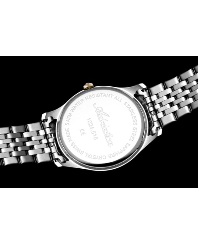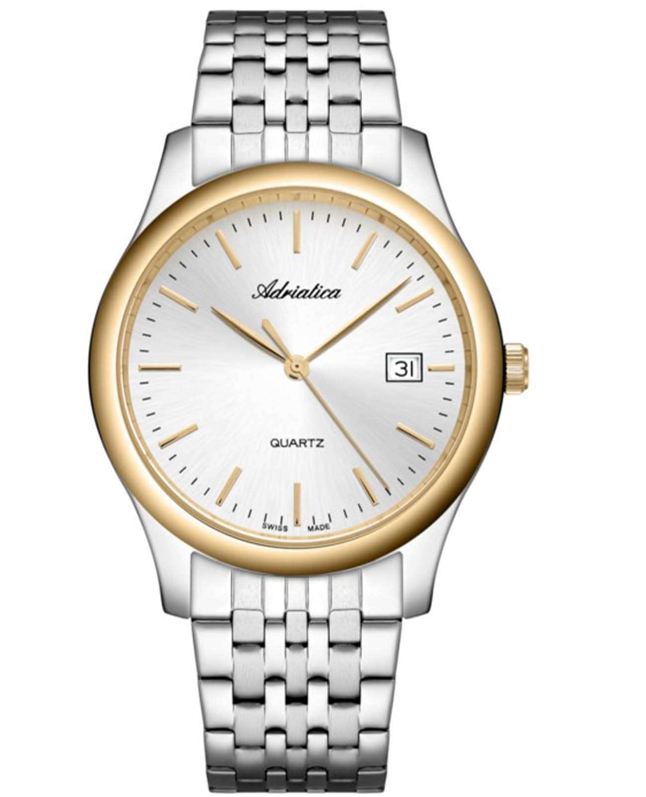 Часы Adriatica A1024.2113Q представляют собой идеальное сочетание элегантности и функциональности, разработанное для современных мужчин. Их стильный циферблат защищен сапфировым стекломСапфировое стеклоПрочный и надёжный материал из кристалла сапфира синтетического происхождения, характеризующийся особой твёрдостью и устойчивостью к царапинам и повреждениям., что придает дополнительную устойчивость к царапинам. Корпус из нержавеющей стали подчеркивает их изысканность и долговечность. Надежный кварцевый механизм с калибром RONDA 515 гарантирует точность времени, а водозащита WR 50 (5 ATM) обеспечивает защиту от воды в различных условиях. Браслет из нержавеющей стали  с раскладной застёжкойРаскладная застёжкаТакой тип застёжки используется только на браслетах из металла. Она никогда не раскрывается полностью, происходит разделение на 2 и более частей. Раскладывающая застёжка снизит вероятность потери часов к минимуму., гармонично дополняет общий дизайн и обеспечивает комфортное ношение на запястье. Часы оснащены функцией отображения даты в окошке в положении 3 часа, что добавляет практичности в повседневной жизни. БезельБезельВнешний ободок, закрепляющий стекло. В спортивных часах так называется поворотное кольцо с делениями на циферблате, выполняет роль таймера – замеряет отрезки времени на шкале. Неподвижный безель – элемент декора. Однонаправленно вращающийся безель на дайверских часах позволяет фиксировать моменты погружения и выныривания на поверхность. с PVD-покрытиемPVDУльтратонкое покрытие наносится в технике вакуумного напыления, сочетает в себе нитрид титана особой прочности со слоем золота или оксида хрома. Несёт в себе декоративную или защитную функцию..