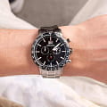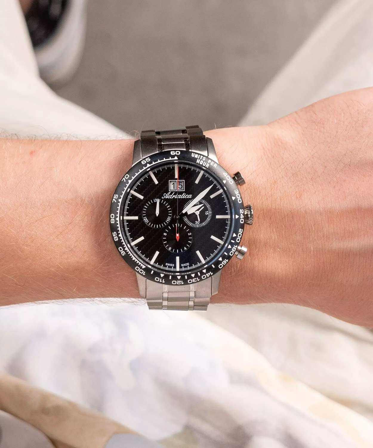 Мужские швейцарские часы-хронографХронографФункция позволяет измерять отрезки времени с особой точностью: часы, минуты, секунды. Верным признаком хронографа является наличие на циферблате 3 дополнительных окошек-счётчиков. с секундомеромСекундомерСекундоме́р — прибор, способный измерять интервалы времени с точностью до долей секунды. и тахиметромТахиметрРазмеченная шкала, располагается на ободке или безеле часов. Тахиметр позволяет рассчитать скорость на определённом участке пути, расстояние измеряется в километрах или милях. Adriatica Aviation A8383.4114CH воплощают в себе элегантность и функциональность, их выбирают целеустремленные мужчины, которые знают цену времени. Черный циферблат часов, защищенный сапфировым стекломСапфировое стеклоПрочный и надёжный материал из кристалла сапфира синтетического происхождения, характеризующийся особой твёрдостью и устойчивостью к царапинам и повреждениям., заключен в корпус из титана диаметром 46 мм и толщиной 12 мм. Надежный кварцевый механизм с калибром Ronda 5040.B обеспечивает высокую точность, а водозащита 5 ATM делает часы устойчивыми к воздействию воды. Стальной браслет с раскладной застёжкойРаскладная застёжкаТакой тип застёжки используется только на браслетах из металла. Она никогда не раскрывается полностью, происходит разделение на 2 и более частей. Раскладывающая застёжка снизит вероятность потери часов к минимуму. обеспечивает комфортное и надежное ношение. Циферблат с метками в виде штрихов имеет 3 дополнительных циферблата, а также окошко даты в положении «12» , что добавляет практичности в повседневной жизни. Люминесцентное покрытиеЛюминесцентное покрытиеПозволяет считывать показания времени в темноте. Производители наносят на стрелки, часовые индексы, безель или поверхность циферблата светонакопительный состав, дающий холодное свечение. на стрелках и метках обеспечивает отличную видимость в темноте.