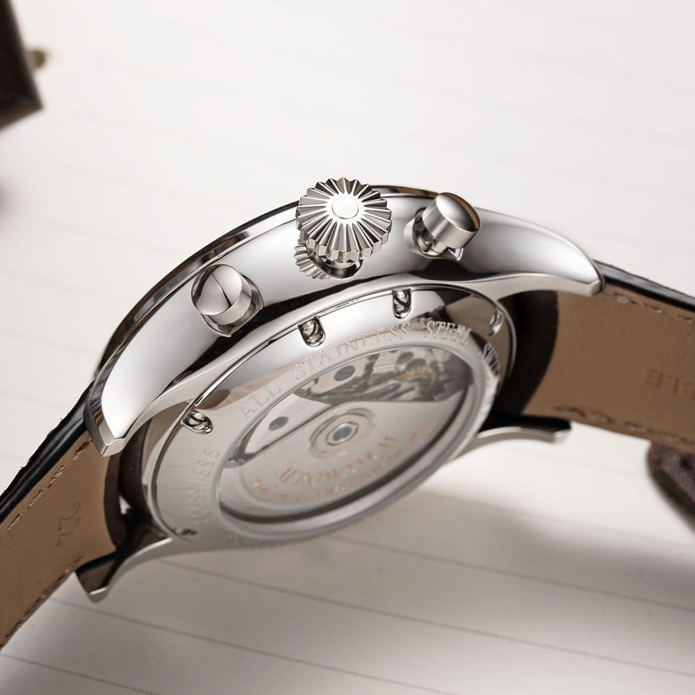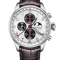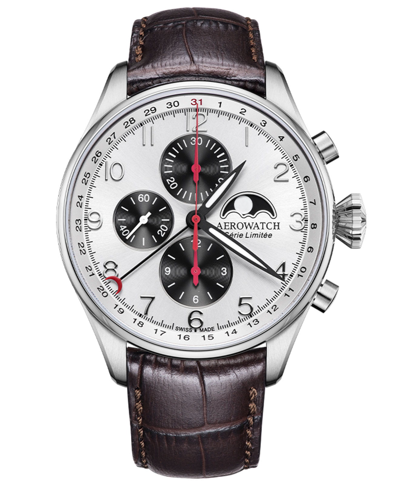 Мужские механические швейцарские часы-хронографХронографФункция позволяет измерять отрезки времени с особой точностью: часы, минуты, секунды. Верным признаком хронографа является наличие на циферблате 3 дополнительных окошек-счётчиков. с автоподзаводом AerowatchLes Grandes Classiques Chrono Moon Phase Limited Edition 69989 AA04. Лимитированное издание 199 экземпляров. Сапфировое стеклоСапфировое стеклоПрочный и надёжный материал из кристалла сапфира синтетического происхождения, характеризующийся особой твёрдостью и устойчивостью к царапинам и повреждениям. устойчивое к появлению царапин, обладающее высокой прозрачностью. Корпус изготовлен из нержавеющей стали. В часах установлен калибр Valjoux 7750 с 25ю камнями. Циферблат украшают стрелки и метки с люминесцентным покрытиемЛюминесцентное покрытиеПозволяет считывать показания времени в темноте. Производители наносят на стрелки, часовые индексы, безель или поверхность циферблата светонакопительный состав, дающий холодное свечение.. На циферблате 3 счетчика, индикация фаз луны на 3 часах, дата по стрелке. Регулировка фазы луны и даты происходит с помощью заводной головки. Класс водозащиты: 50 метров, позволит защитить корпус от случайных брызг или капель дождя. Кожаный ремешок на стандартной застёжке.