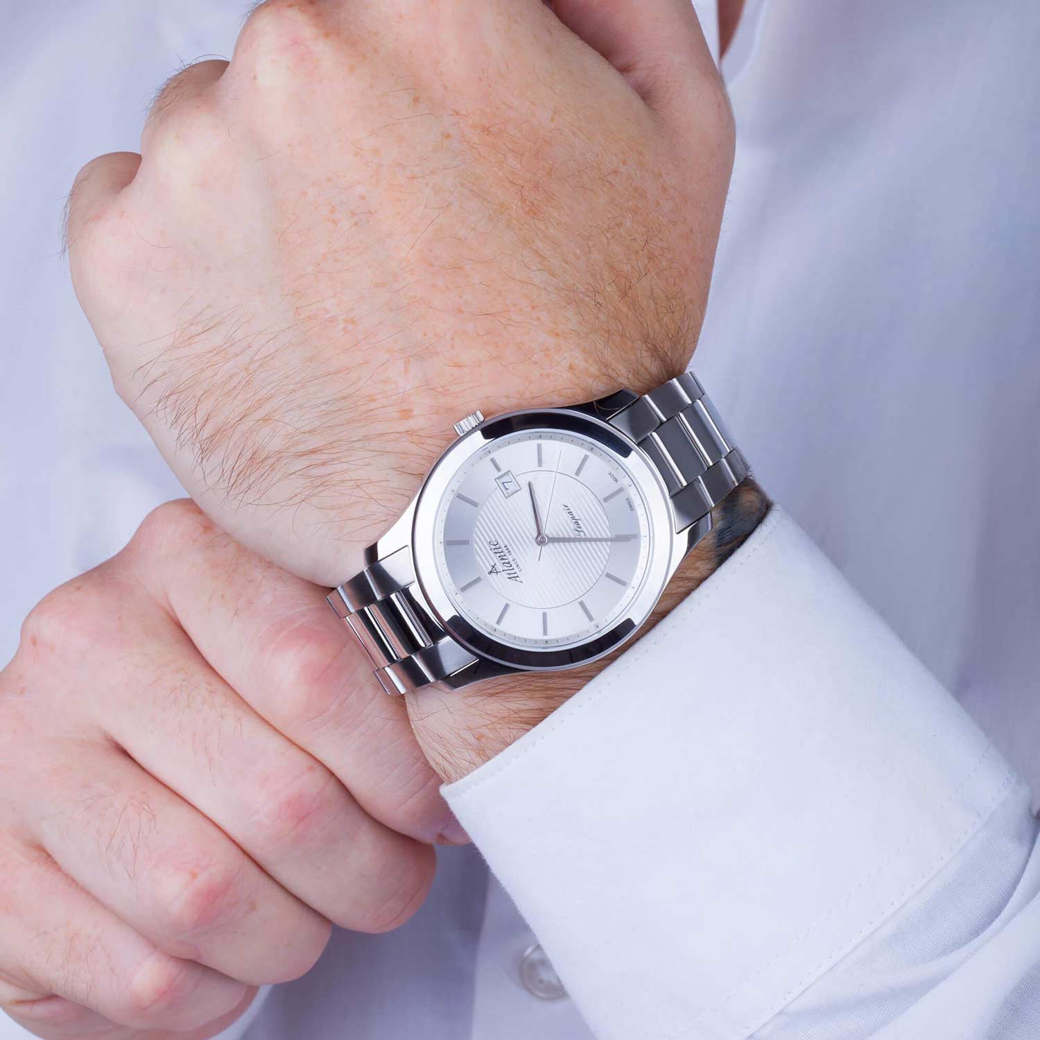 Мужские кварцевые швейцарские часы Atlantic 60335.41.21, механизм с высокой точностью. Циферблат часов с сапфировым стекломСапфировое стеклоПрочный и надёжный материал из кристалла сапфира синтетического происхождения, характеризующийся особой твёрдостью и устойчивостью к царапинам и повреждениям., устойчивым к появлению царапин и обладающее высокой прозрачностью. Класс водозащиты: 30 метров, позволит защитить корпус от случайных брызг или капель дождя. Корпус часов изготовлен из нержавеющей стали. Стальной браслет на раскладной застёжкеРаскладная застёжкаТакой тип застёжки используется только на браслетах из металла. Она никогда не раскрывается полностью, происходит разделение на 2 и более частей. Раскладывающая застёжка снизит вероятность потери часов к минимуму.. Окошко даты находится в положении 3 часа.