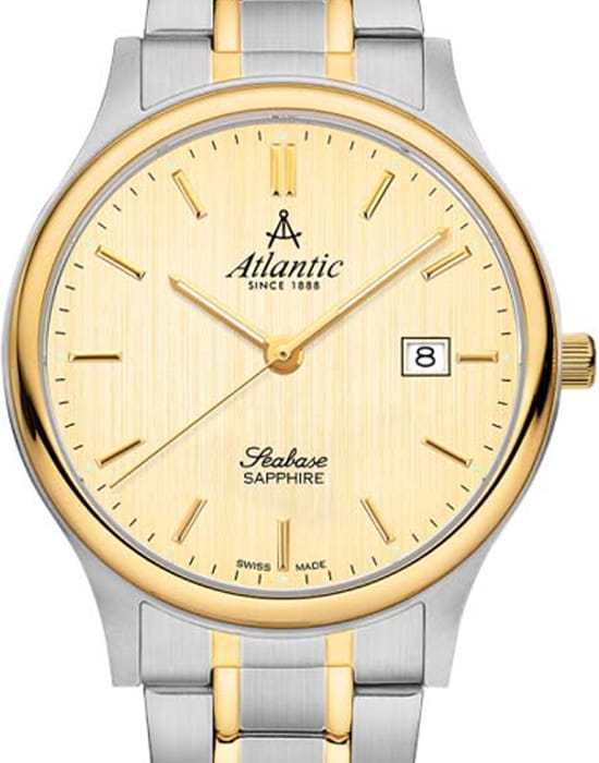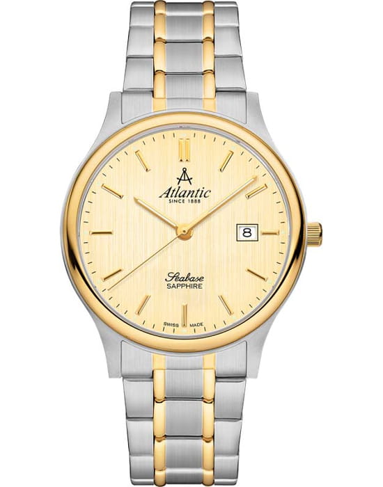Мужские кварцевые швейцарские часы Atlantic Seapair 60348.43.31, механизм с высокой точностью. Циферблат часов с сапфировым стекломСапфировое стеклоПрочный и надёжный материал из кристалла сапфира синтетического происхождения, характеризующийся особой твёрдостью и устойчивостью к царапинам и повреждениям., устойчивым к появлению царапин и обладающее высокой прозрачностью. Класс водозащиты: 30 метров, позволит защитить корпус от случайных брызг или капель дождя. Корпус часов изготовлен из нержавеющей стали. Стальной браслет с PVD-покрытиемPVDУльтратонкое покрытие наносится в технике вакуумного напыления, сочетает в себе нитрид титана особой прочности со слоем золота или оксида хрома. Несёт в себе декоративную или защитную функцию. на раскладной застёжкеРаскладная застёжкаТакой тип застёжки используется только на браслетах из металла. Она никогда не раскрывается полностью, происходит разделение на 2 и более частей. Раскладывающая застёжка снизит вероятность потери часов к минимуму.. Окошко даты находится в положении 3 часа. БезельБезельВнешний ободок, закрепляющий стекло. В спортивных часах так называется поворотное кольцо с делениями на циферблате, выполняет роль таймера – замеряет отрезки времени на шкале. Неподвижный безель – элемент декора. Однонаправленно вращающийся безель на дайверских часах позволяет фиксировать моменты погружения и выныривания на поверхность. с PVD-покрытиемPVDУльтратонкое покрытие наносится в технике вакуумного напыления, сочетает в себе нитрид титана особой прочности со слоем золота или оксида хрома. Несёт в себе декоративную или защитную функцию..