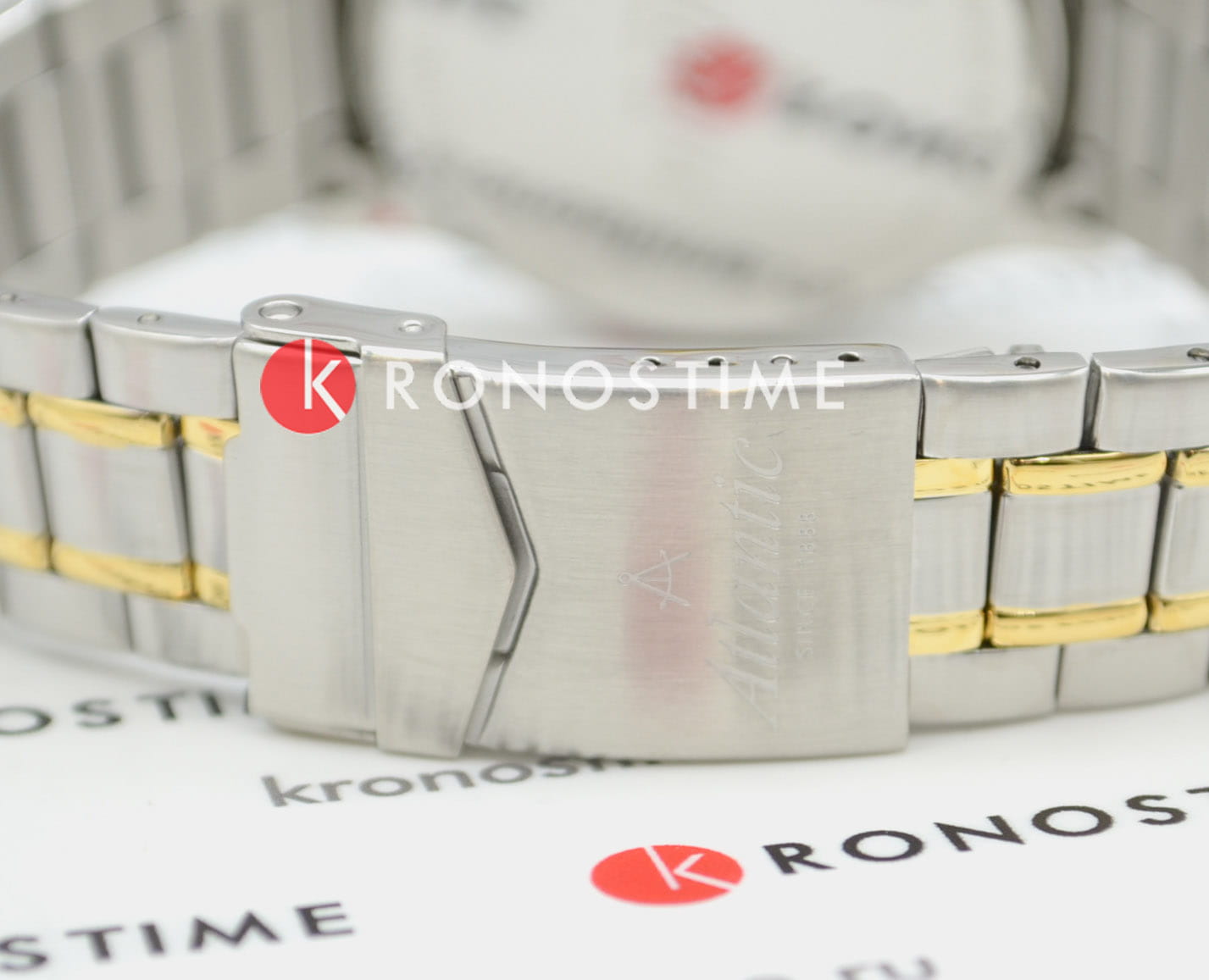 Мужские швейцарские часы-хронографХронографФункция позволяет измерять отрезки времени с особой точностью: часы, минуты, секунды. Верным признаком хронографа является наличие на циферблате 3 дополнительных окошек-счётчиков. с секундомеромСекундомерСекундоме́р — прибор, способный измерять интервалы времени с точностью до долей секунды. Atlantic Seabase 64457.43.58G, кварцевый механизм с высокой точностью. Cапфировое стеклоСапфировое стеклоПрочный и надёжный материал из кристалла сапфира синтетического происхождения, характеризующийся особой твёрдостью и устойчивостью к царапинам и повреждениям. устойчивое к появлению царапин и обладающее высокой прозрачностью. Корпус и браслет часов изготовлены из нержавеющей стали с частичным PVDPVDУльтратонкое покрытие наносится в технике вакуумного напыления, сочетает в себе нитрид титана особой прочности со слоем золота или оксида хрома. Несёт в себе декоративную или защитную функцию. покрытием. На циферблате расположены римские цифры, два дополнительных индикатора, окошко даты в положении 3 часов. Класс водозащиты: 50 метров, позволит защитить корпус от случайных брызг или капель дождя. Стальной браслет на раскладной застёжкеРаскладная застёжкаТакой тип застёжки используется только на браслетах из металла. Она никогда не раскрывается полностью, происходит разделение на 2 и более частей. Раскладывающая застёжка снизит вероятность потери часов к минимуму..