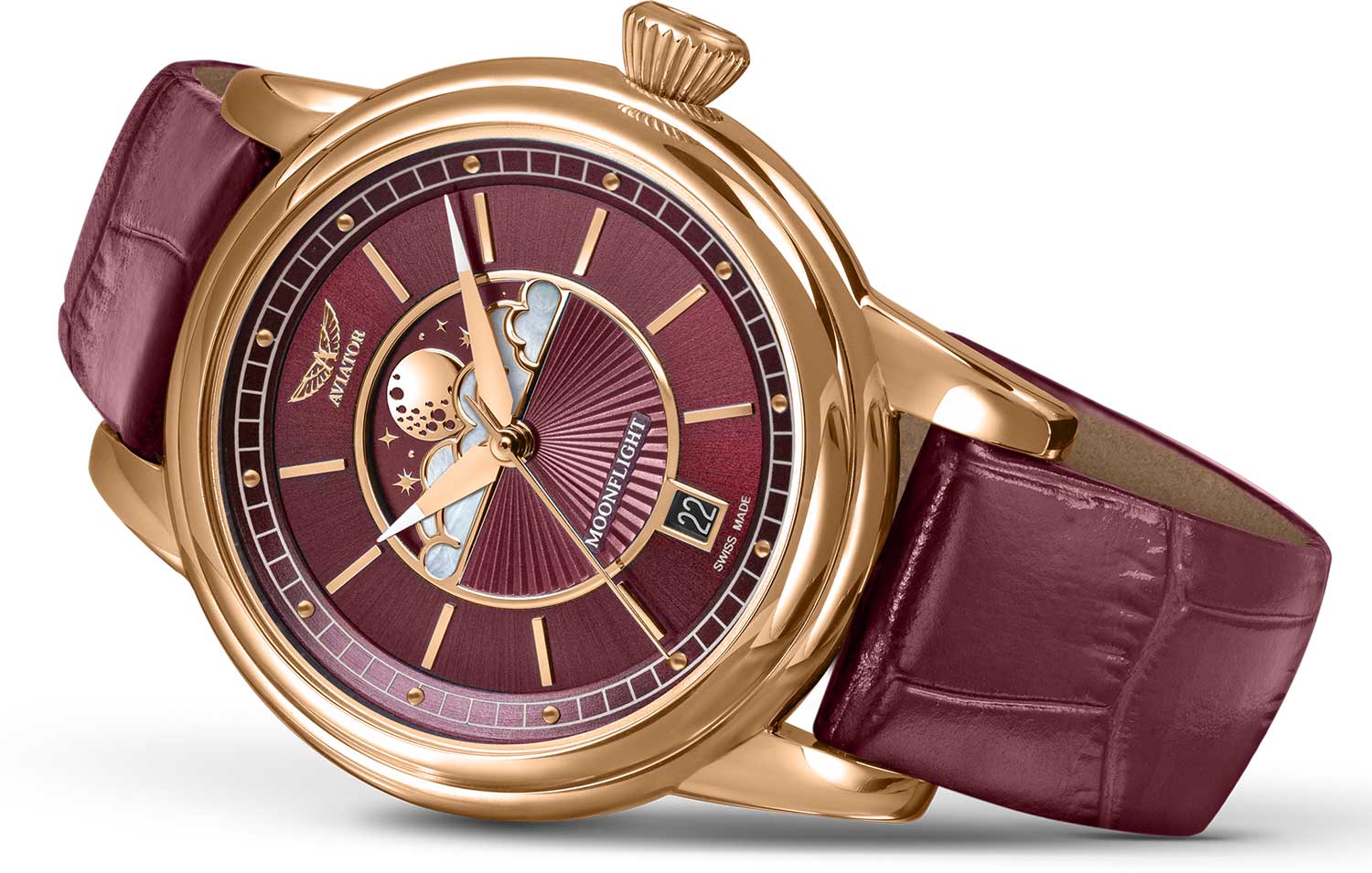 Aviator V.1.33.2.265.4 “Douglas Moonflight” — элегантный дамский швейцарский Moonphase с утончённой авиационной эстетикой. Корпус 36 мм из нержавеющей стали с PVD-покрытиемPVDУльтратонкое покрытие наносится в технике вакуумного напыления, сочетает в себе нитрид титана особой прочности со слоем золота или оксида хрома. Несёт в себе декоративную или защитную функцию. с полированной отделкой обладает компактными пропорциями и удобным литым профилем.