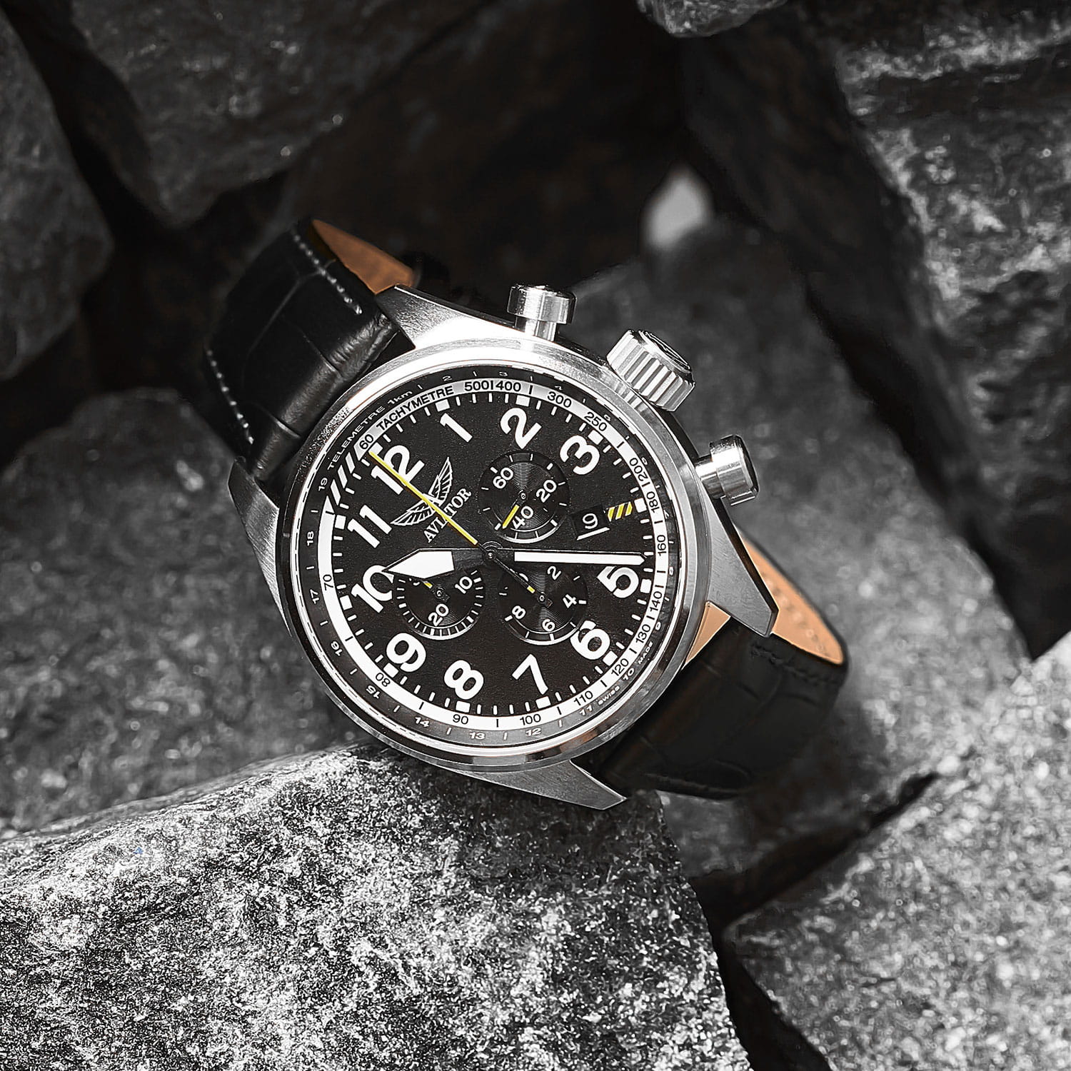 Aviator Airacobra V.2.25.0.169.4 — швейцарский GMT-хронограф в духе пилотских инструментов, объединяющий точность, удобство и лаконичный дизайн. Диаметр корпуса — 45 мм, выполнен из нержавеющей стали, что подчёркивает техническую надёжность в образе часов.