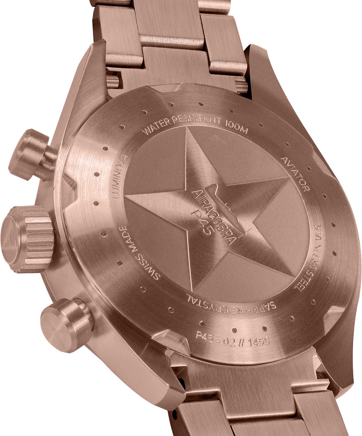 Aviator Airacobra V.2.25.2.173.5 — швейцарский GMT-хронограф в духе пилотских инструментов, объединяющий точность, удобство и лаконичный дизайн. Диаметр корпуса — 45 мм, выполнен из нержавеющей стали с PVD-покрытиемPVDУльтратонкое покрытие наносится в технике вакуумного напыления, сочетает в себе нитрид титана особой прочности со слоем золота или оксида хрома. Несёт в себе декоративную или защитную функцию., что подчёркивает техническую надёжность в образе часов.