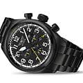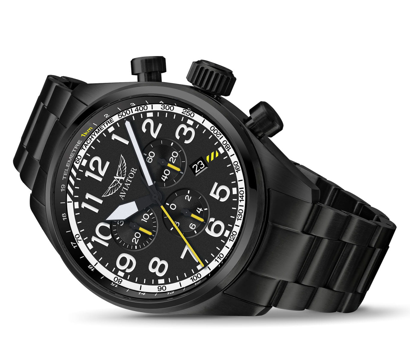 Aviator Airacobra P45 Chrono V.2.25.5.169.5 — швейцарские часы в духе пилотских инструментов, объединяющий точность, удобство и лаконичный дизайн. Диаметр корпуса — 45 мм, выполнен из нержавеющей стали 316L с PVD-покрытиемPVDУльтратонкое покрытие наносится в технике вакуумного напыления, сочетает в себе нитрид титана особой прочности со слоем золота или оксида хрома. Несёт в себе декоративную или защитную функцию., что подчёркивает техническую надёжность в образе часов. Циферблат оформлен в классическом aviator-стиле: крупные арабские цифры, широкие стрелки и чёткое деление минут позволяют считывать время мгновенно. Стрелки и метки покрыты люминесцентным покрытиемЛюминесцентное покрытиеПозволяет считывать показания времени в темноте. Производители наносят на стрелки, часовые индексы, безель или поверхность циферблата светонакопительный состав, дающий холодное свечение. Superluminova для отличной читаемости при слабом освещении. Циферблат защищён стойким сапфировым стекломСапфировое стеклоПрочный и надёжный материал из кристалла сапфира синтетического происхождения, характеризующийся особой твёрдостью и устойчивостью к царапинам и повреждениям. с антибликовым покрытиемАнтибликовое покрытиеСлой оксида металла в 0,13-0,3 микрон, благодаря которому стекло часов не бликует и не отражает свет. Антибликовое покрытие уменьшает отражение света в 10 раз, обеспечивая отличную читаемость показателей циферблата.. У модели присутствуют дата и точный откидной механизм завинчивающейся заводной головки и задней крышки, обеспечивающий надёжную водозащиту до 100 м и защиту от ударов. Внутри установлен швейцарский кварцевый механизм, который обеспечивает функции хронографаХронографФункция позволяет измерять отрезки времени с особой точностью: часы, минуты, секунды. Верным признаком хронографа является наличие на циферблате 3 дополнительных окошек-счётчиков.. Функции добавить (ADD) и разделить (SPLIT). Часы комплектуются браслетом из нержавеющей стали с PVD-покрытиемPVDУльтратонкое покрытие наносится в технике вакуумного напыления, сочетает в себе нитрид титана особой прочности со слоем золота или оксида хрома. Несёт в себе декоративную или защитную функцию. с удобной раскладной застёжкойРаскладная застёжкаТакой тип застёжки используется только на браслетах из металла. Она никогда не раскрывается полностью, происходит разделение на 2 и более частей. Раскладывающая застёжка снизит вероятность потери часов к минимуму., обеспечивающей надёжную фиксацию и комфорт при ежедневной носке. Эти изысканные часы так же обладают функциями тахиметраТахиметрРазмеченная шкала, располагается на ободке или безеле часов. Тахиметр позволяет рассчитать скорость на определённом участке пути, расстояние измеряется в километрах или милях., секундомераСекундомерСекундоме́р — прибор, способный измерять интервалы времени с точностью до долей секунды. и телеметра. Airacobra — это практичный и стильный инструмент для путешествий и активной повседневности, объединяющий авиационную эстетику, точный механизм и удобство.