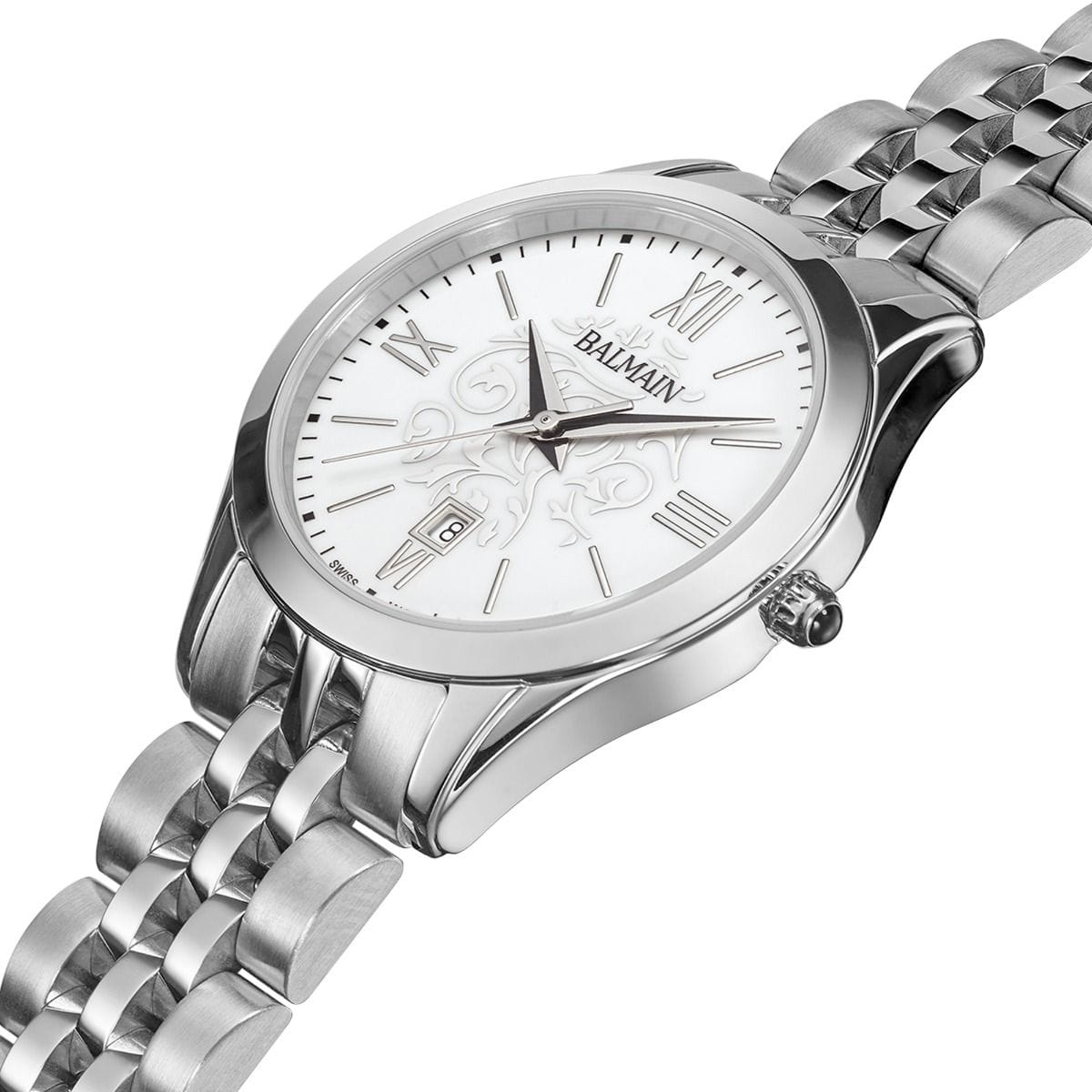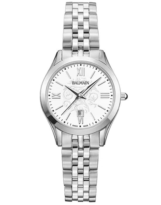 Женские часы Balmain Classic R B4111.31.12 кварцевый механизм с высокой точностью. Сапфировое стеклоСапфировое стеклоПрочный и надёжный материал из кристалла сапфира синтетического происхождения, характеризующийся особой твёрдостью и устойчивостью к царапинам и повреждениям. устойчивое к появлению царапин, обладающее высокой прозрачностью. Корпус изготовлен из нержавеющей стали. Класс водозащиты: 50 метров, позволит защитить корпус от случайных брызг или капель дождя. Стальной браслет на застёжке «бабочка» с кнопкамиЗастёжка "бабочка"Такой вид застёжки дополняется предохранителями, помогающими избежать случайного раскрытия браслета. Обладают изящным исполнением. . Окошко даты находится в положении 6 часов.