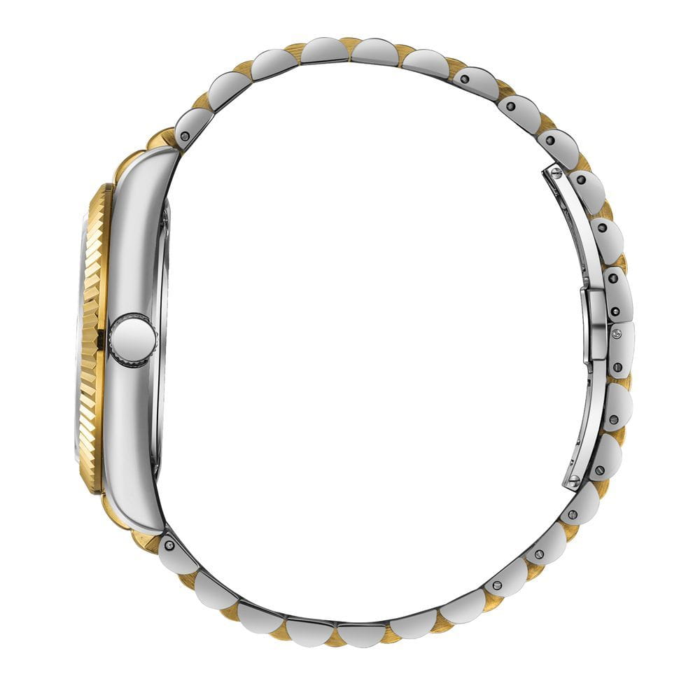 Браслет из нержавеющей стали также покрыт износостойким PVD-покрытиемPVDУльтратонкое покрытие наносится в технике вакуумного напыления, сочетает в себе нитрид титана особой прочности со слоем золота или оксида хрома. Несёт в себе декоративную или защитную функцию. и дополнен классической застёжкой с кнопочным механизмом для лёгкой и надёжной фиксации. Водонепроницаемость до 50 метров обеспечивает базовую защиту от влаги и дождя.