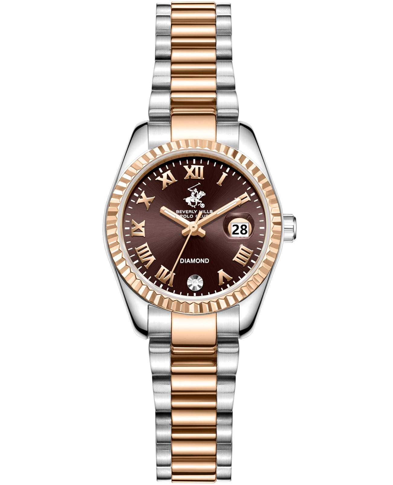 Американские женские часы Beverly Hills Polo Club BP3819X.540 - это стильный женский аксессуар, который сочетает элегантный дизайн и практичность. Корпус выполнен из нержавеющей стали серебристого цвета, диаметром 28 мм, что обеспечивает долговечность и утончённый внешний вид. Надежное минеральное стеклоМинеральное стеклоМинеральное стекло представляет собой искусственно выращенный минерал кварца. Такое стекло отличается особой устойчивостью к повреждениям и царапинам. Уступает по некоторым качествам сапфировому стеклу. с сапфировым покрытием защищает циферблат от царапин и обеспечивает долговечность. Метки в виде римский цифр, на 6 часов инкрустирован синтетический бриллиант. Неподвижный безельБезельВнешний ободок, закрепляющий стекло. В спортивных часах так называется поворотное кольцо с делениями на циферблате, выполняет роль таймера – замеряет отрезки времени на шкале. Неподвижный безель – элемент декора. Однонаправленно вращающийся безель на дайверских часах позволяет фиксировать моменты погружения и выныривания на поверхность. с IP-покрытиемIP-покрытиеМетод ионного напыления. Демонстрирует повышенную устойчивость к истиранию, окислению и химическим веществам. Под воздействием высокого давления и температуры около 1500°C молекулы металла надёжно соединяются с частицами корпуса часов. цвета розового золота. Модель оснащена кварцевым механизмом, обеспечивающим высокую точность хода. Стрелки с люминесцентным покрытиемЛюминесцентное покрытиеПозволяет считывать показания времени в темноте. Производители наносят на стрелки, часовые индексы, безель или поверхность циферблата светонакопительный состав, дающий холодное свечение.. Стальной браслет на застёжке-бабочке с кнопкамиЗастёжка "бабочка"Такой вид застёжки дополняется предохранителями, помогающими избежать случайного раскрытия браслета. Обладают изящным исполнением. обеспечивает комфортное ношение. Водозащита 30 метров позволит защитить корпус от случайных брызг или капель дождя. Эта модель – отличный выбор для тех, кто ищет сочетание стиля, качества и функциональности. Часы станут не только полезным аксессуаром, но и выразительным элементом вашего имиджа.
