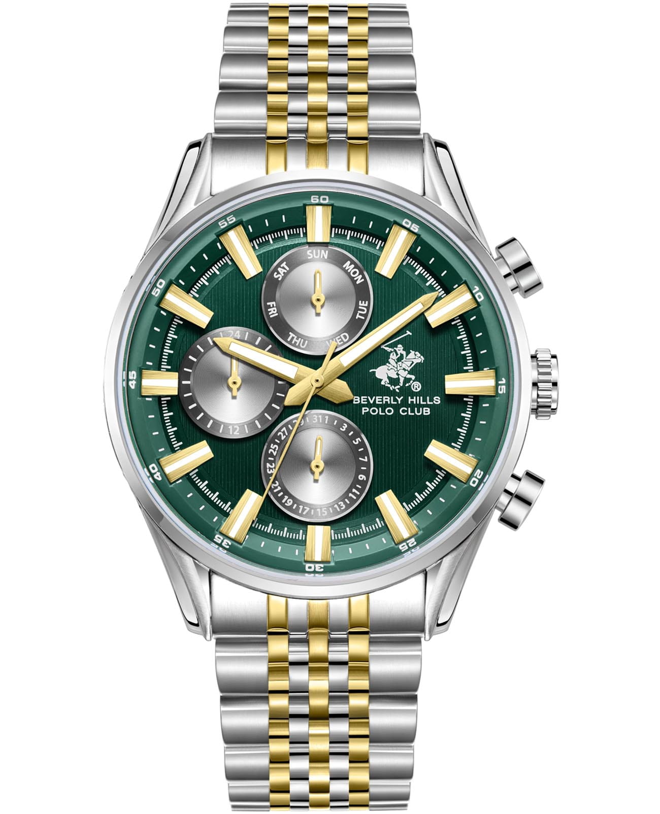 BEVERLY HILLS POLO CLUB BP3823X.270 — стильные мужские часы, сочетающие спортивную динамику и функциональность. Крупный корпус выполнен из нержавеющей стали серебристого цвета, диаметром 42,5 мм, гармонично дополнен стальным браслетом с частичным IP-покрытиемIP-покрытиеМетод ионного напыления. Демонстрирует повышенную устойчивость к истиранию, окислению и химическим веществам. Под воздействием высокого давления и температуры около 1500°C молекулы металла надёжно соединяются с частицами корпуса часов. на раскладной застёжкеРаскладная застёжкаТакой тип застёжки используется только на браслетах из металла. Она никогда не раскрывается полностью, происходит разделение на 2 и более частей. Раскладывающая застёжка снизит вероятность потери часов к минимуму., что обеспечивает комфортное ношение. Минеральное стеклоМинеральное стеклоМинеральное стекло представляет собой искусственно выращенный минерал кварца. Такое стекло отличается особой устойчивостью к повреждениям и царапинам. Уступает по некоторым качествам сапфировому стеклу. с сапфировым покрытием защищает циферблат от царапин, а кварцевый механизм обеспечивает высокую точность. Благодаря своей универсальной эстетике эти часы уместны и в деловой среде, и в повседневном образе. Стрелки и метки с люминесцентным покрытиемЛюминесцентное покрытиеПозволяет считывать показания времени в темноте. Производители наносят на стрелки, часовые индексы, безель или поверхность циферблата светонакопительный состав, дающий холодное свечение., обеспечивающим хорошую читаемость в темноте. Указатель дня недели вынесен на отдельный циферблат, также присутствует индикация 24-часового формата времени. Идеальный выбор для тех, кто ценит элегантный дизайн и качество. Водозащита до 50 метров позволит защитить корпус от случайных брызг или капель дождя.