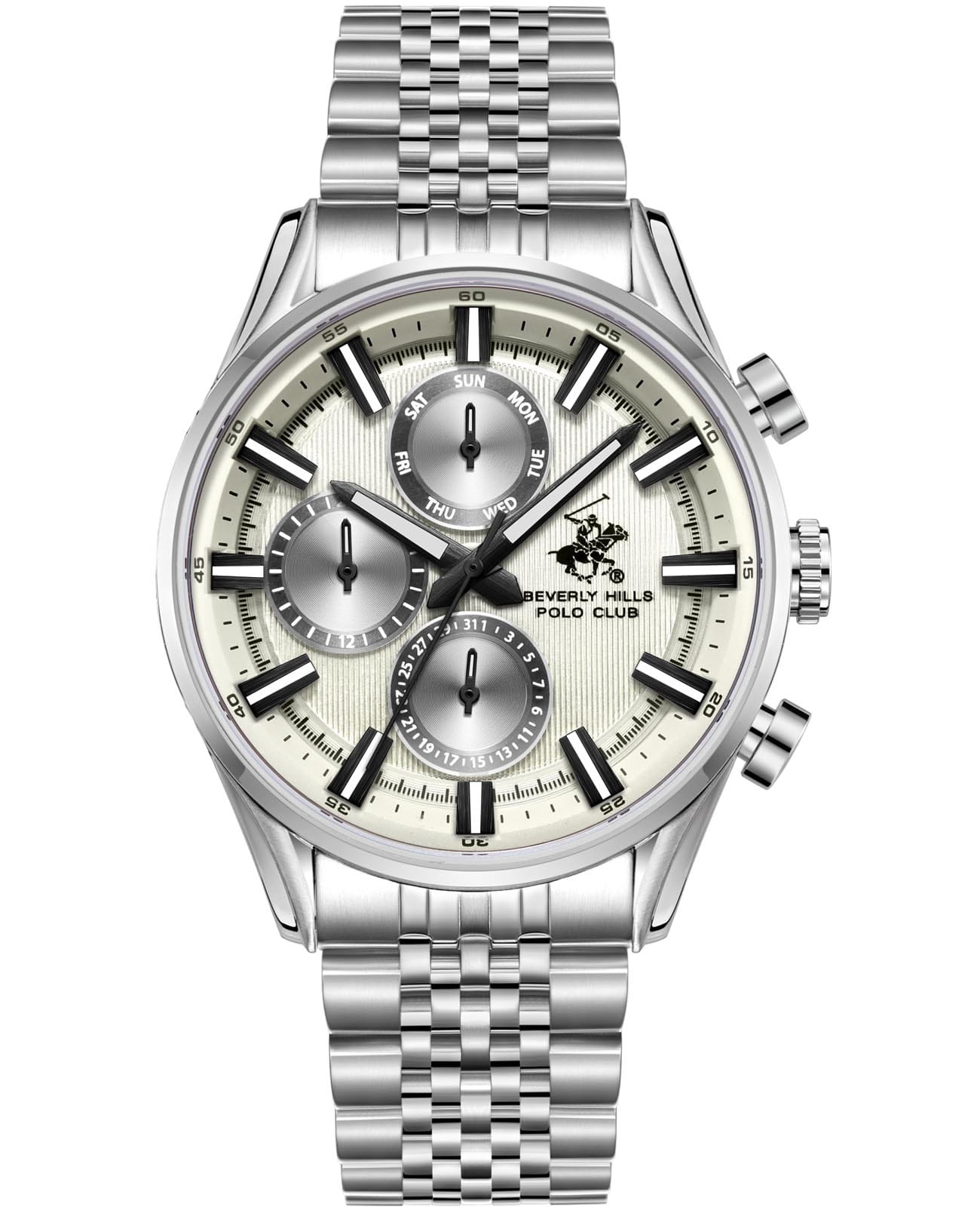 BEVERLY HILLS POLO CLUB BP3823X.360 — стильные мужские часы, сочетающие спортивную динамику и функциональность. Крупный корпус выполнен из нержавеющей стали серебристого цвета, диаметром 42,5 мм, гармонично дополнен стальным браслетом на раскладной застёжкеРаскладная застёжкаТакой тип застёжки используется только на браслетах из металла. Она никогда не раскрывается полностью, происходит разделение на 2 и более частей. Раскладывающая застёжка снизит вероятность потери часов к минимуму., что обеспечивает комфортное ношение. Минеральное стеклоМинеральное стеклоМинеральное стекло представляет собой искусственно выращенный минерал кварца. Такое стекло отличается особой устойчивостью к повреждениям и царапинам. Уступает по некоторым качествам сапфировому стеклу. с сапфировым покрытием защищает циферблат от царапин, а кварцевый механизм обеспечивает высокую точность. Благодаря своей универсальной эстетике эти часы уместны и в деловой среде, и в повседневном образе. Стрелки и метки с люминесцентным покрытиемЛюминесцентное покрытиеПозволяет считывать показания времени в темноте. Производители наносят на стрелки, часовые индексы, безель или поверхность циферблата светонакопительный состав, дающий холодное свечение., обеспечивающим хорошую читаемость в темноте. Указатель дня недели вынесен на отдельный циферблат, также присутствует индикация 24-часового формата времени. Идеальный выбор для тех, кто ценит элегантный дизайн и качество. Водозащита до 50 метров позволит защитить корпус от случайных брызг или капель дождя.