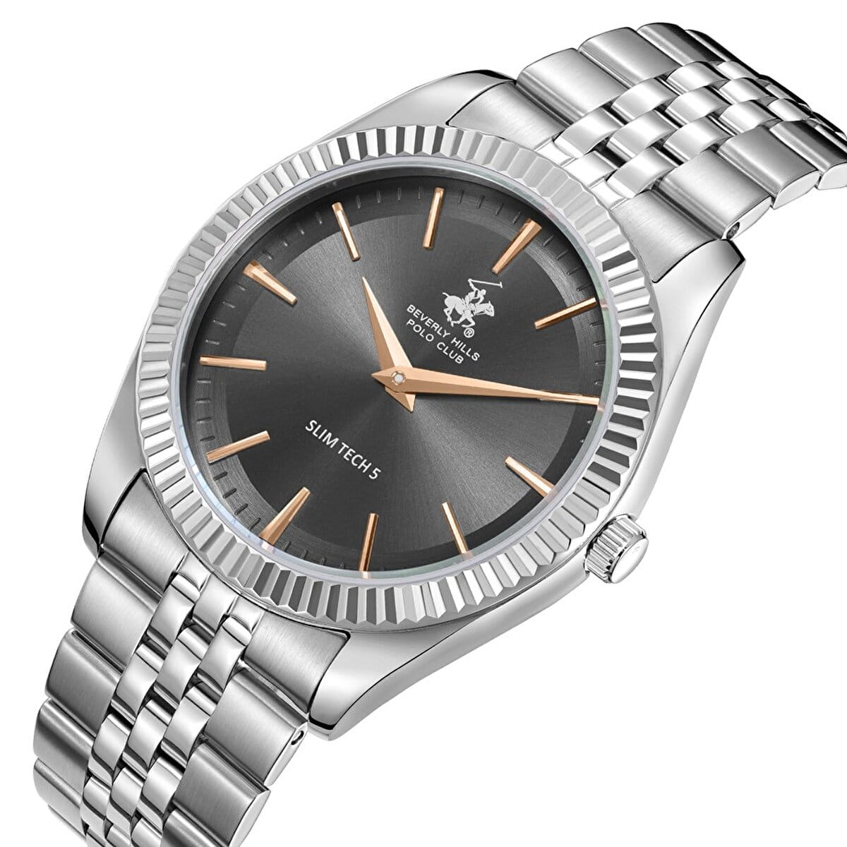 Мужские кварцевые часы Beverly Hills Polo Club — это идеальный выбор для ценителей минимализма и функциональности. Корпус диаметром 39 мм выполнен из нержавеющей стали. Циферблат чёрного цвета оформлен штрихами и стрелками. Циферблат защищён минеральным стекломМинеральное стеклоМинеральное стекло представляет собой искусственно выращенный минерал кварца. Такое стекло отличается особой устойчивостью к повреждениям и царапинам. Уступает по некоторым качествам сапфировому стеклу. с сапфировым покрытием. Часы оснащены стальным браслетом из нержавеющей стали на застёжке «бабочка» с кнопкамиЗастёжка "бабочка"Такой вид застёжки дополняется предохранителями, помогающими избежать случайного раскрытия браслета. Обладают изящным исполнением. . Водонепроницаемость 50 м позволяет использовать часы в повседневных условиях. Идеальный выбор для тех, кто ценит американское качество и универсальный дизайн.