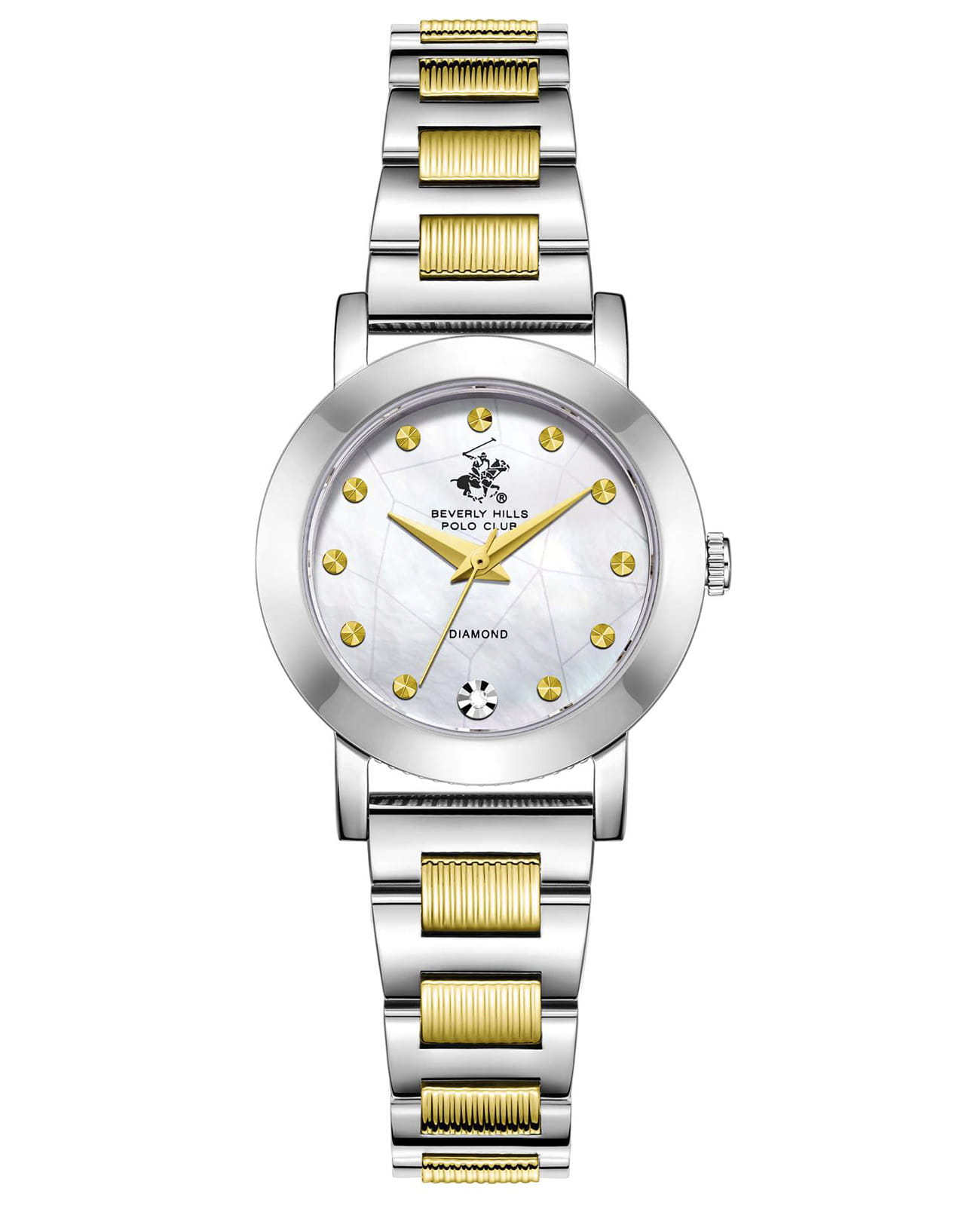 Женские кварцевые часы Beverly Hills Polo Club — это символ безупречного вкуса и роскоши. Корпус диаметром 28 мм выполнен из стали 316L. Циферблат перламутрового цвета оформлен точками, стрелками и инкрустирован одним синтетическим бриллиантом. Циферблат защищён минеральным стекломМинеральное стеклоМинеральное стекло представляет собой искусственно выращенный минерал кварца. Такое стекло отличается особой устойчивостью к повреждениям и царапинам. Уступает по некоторым качествам сапфировому стеклу. с сапфировым покрытием. Часы оснащены стальным браслетом с частичным IP-покрытиемIP-покрытиеМетод ионного напыления. Демонстрирует повышенную устойчивость к истиранию, окислению и химическим веществам. Под воздействием высокого давления и температуры около 1500°C молекулы металла надёжно соединяются с частицами корпуса часов. цвета жёлтого золота на застёжке «бабочка» с кнопкамиЗастёжка "бабочка"Такой вид застёжки дополняется предохранителями, помогающими избежать случайного раскрытия браслета. Обладают изящным исполнением. . Водонепроницаемость 30 м позволяет использовать часы в повседневных условиях. Идеальный выбор для тех, кто ценит американское качество и универсальный дизайн.