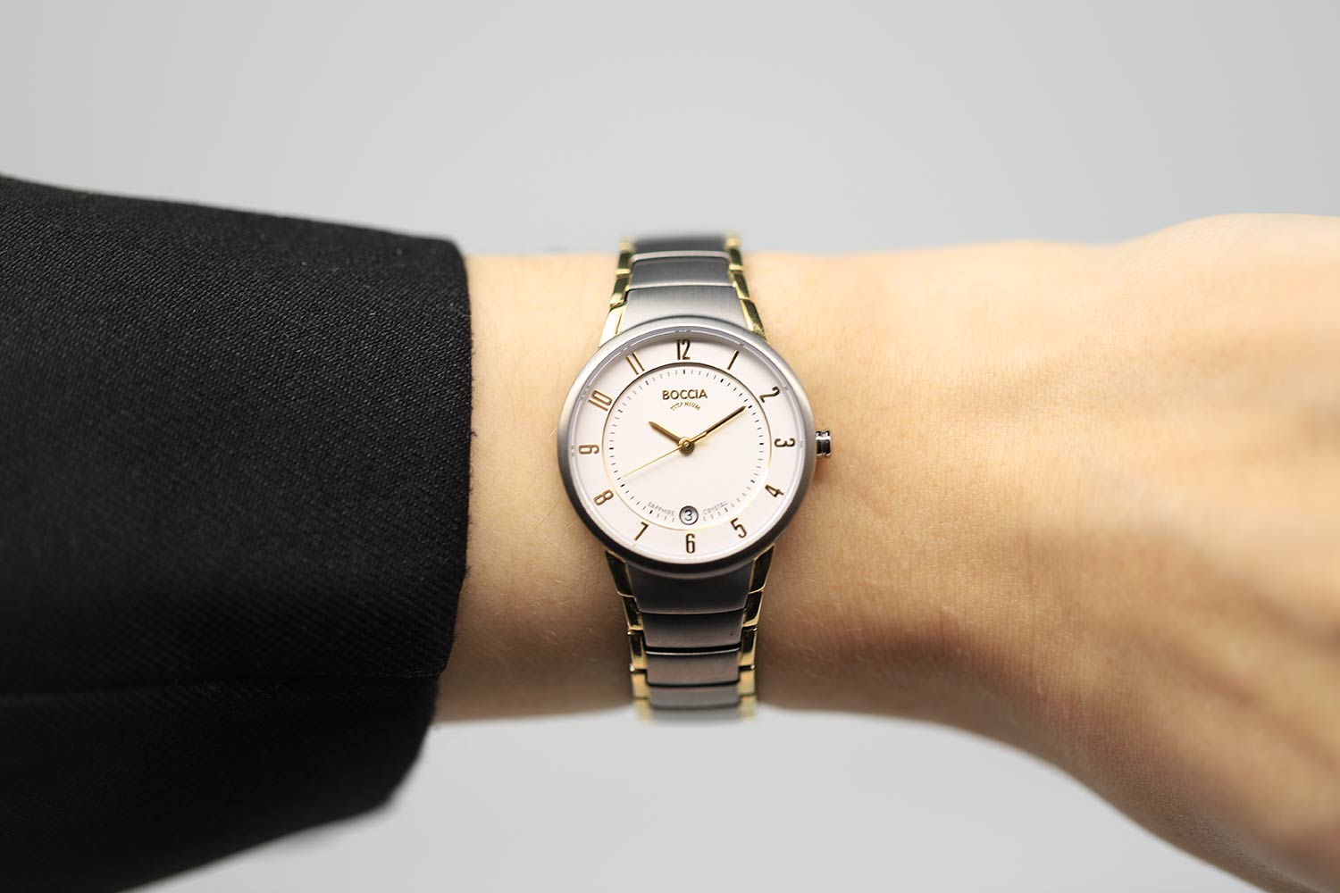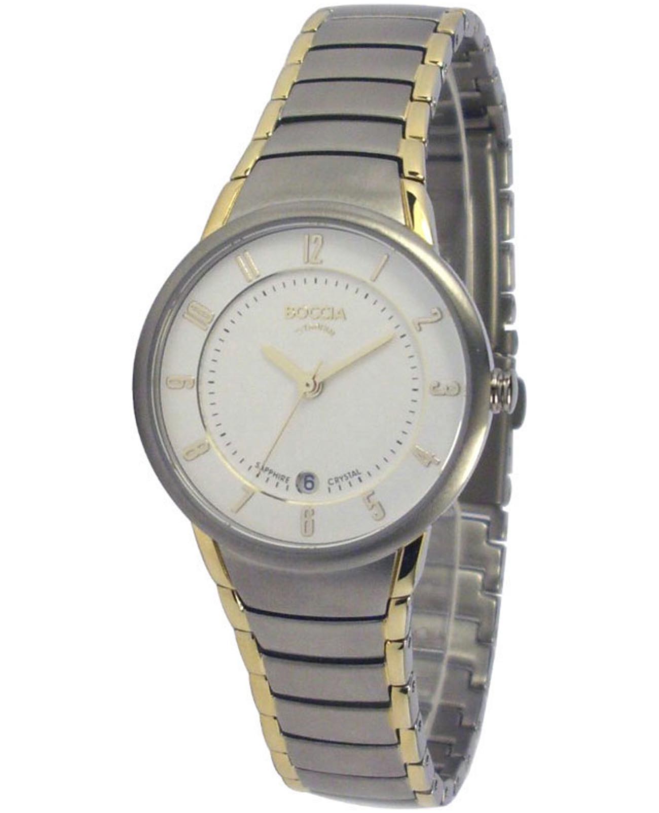 Женские наручные часы Boccia Titanium 3158-02 с надёжным кварцевым механизмом. Корпус и браслет часов изготовлены из титана с частичным PVD-покрытиемPVDУльтратонкое покрытие наносится в технике вакуумного напыления, сочетает в себе нитрид титана особой прочности со слоем золота или оксида хрома. Несёт в себе декоративную или защитную функцию.. Стальной браслет на раскладной застёжкеРаскладная застёжкаТакой тип застёжки используется только на браслетах из металла. Она никогда не раскрывается полностью, происходит разделение на 2 и более частей. Раскладывающая застёжка снизит вероятность потери часов к минимуму.. Окошко даты находится в положении 6 часов. Класс водозащиты: 50 метров, позволит защитить корпус от случайных брызг или капель дождя. Сапфировое стеклоСапфировое стеклоПрочный и надёжный материал из кристалла сапфира синтетического происхождения, характеризующийся особой твёрдостью и устойчивостью к царапинам и повреждениям. с антибликовым покрытием, устойчивое к мелким механическим повреждениям.