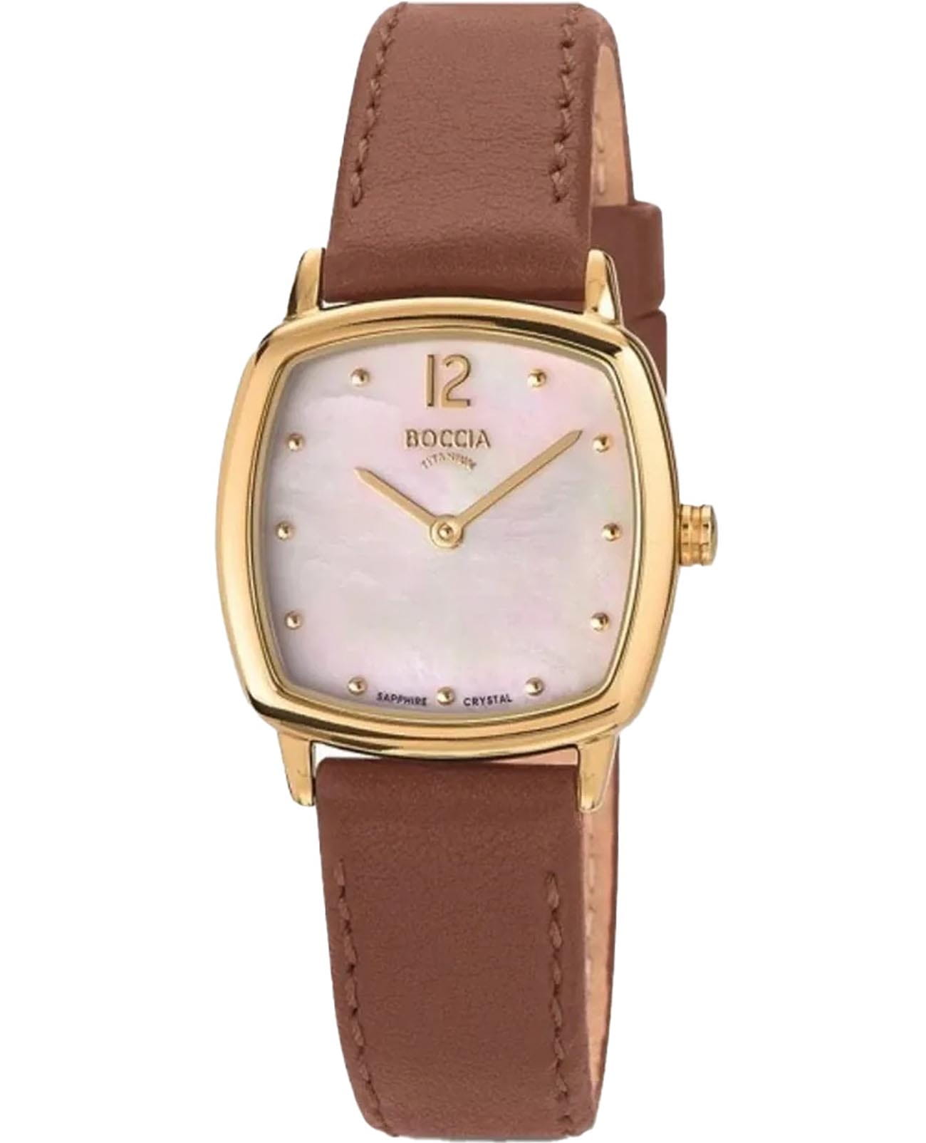 Женские наручные часы Boccia Titanium 3343-02 с надёжным кварцевым механизмом. Корпус часов изготовлен из титана с PVD-покрытиемPVDУльтратонкое покрытие наносится в технике вакуумного напыления, сочетает в себе нитрид титана особой прочности со слоем золота или оксида хрома. Несёт в себе декоративную или защитную функцию.. Сапфировое стеклоСапфировое стеклоПрочный и надёжный материал из кристалла сапфира синтетического происхождения, характеризующийся особой твёрдостью и устойчивостью к царапинам и повреждениям. устойчивое к мелким механическим повреждениям. Класс водозащиты: 50 метров, позволит защитить корпус от случайных брызг или капель дождя. Кожаный ремешок на стандартной застёжке.