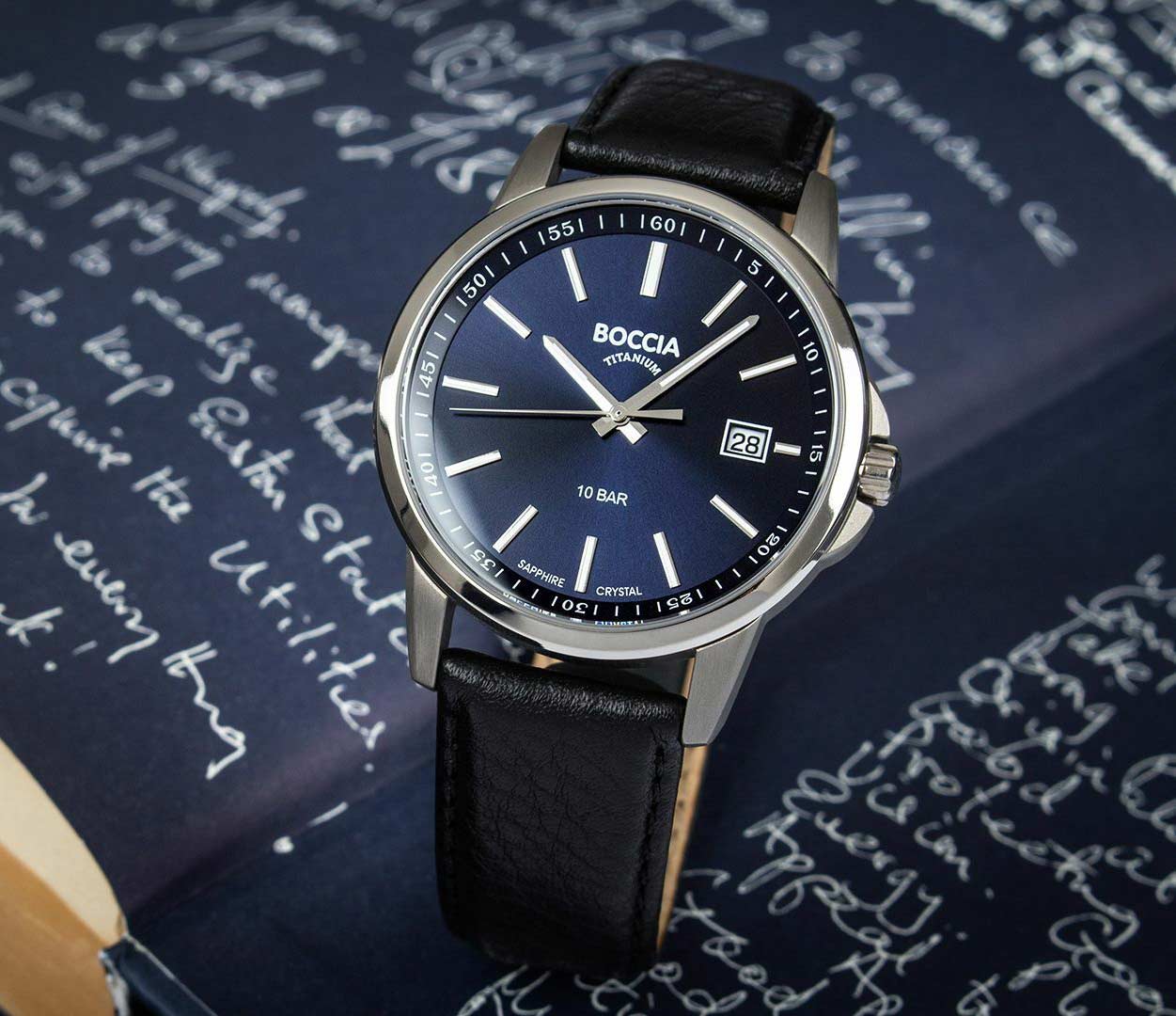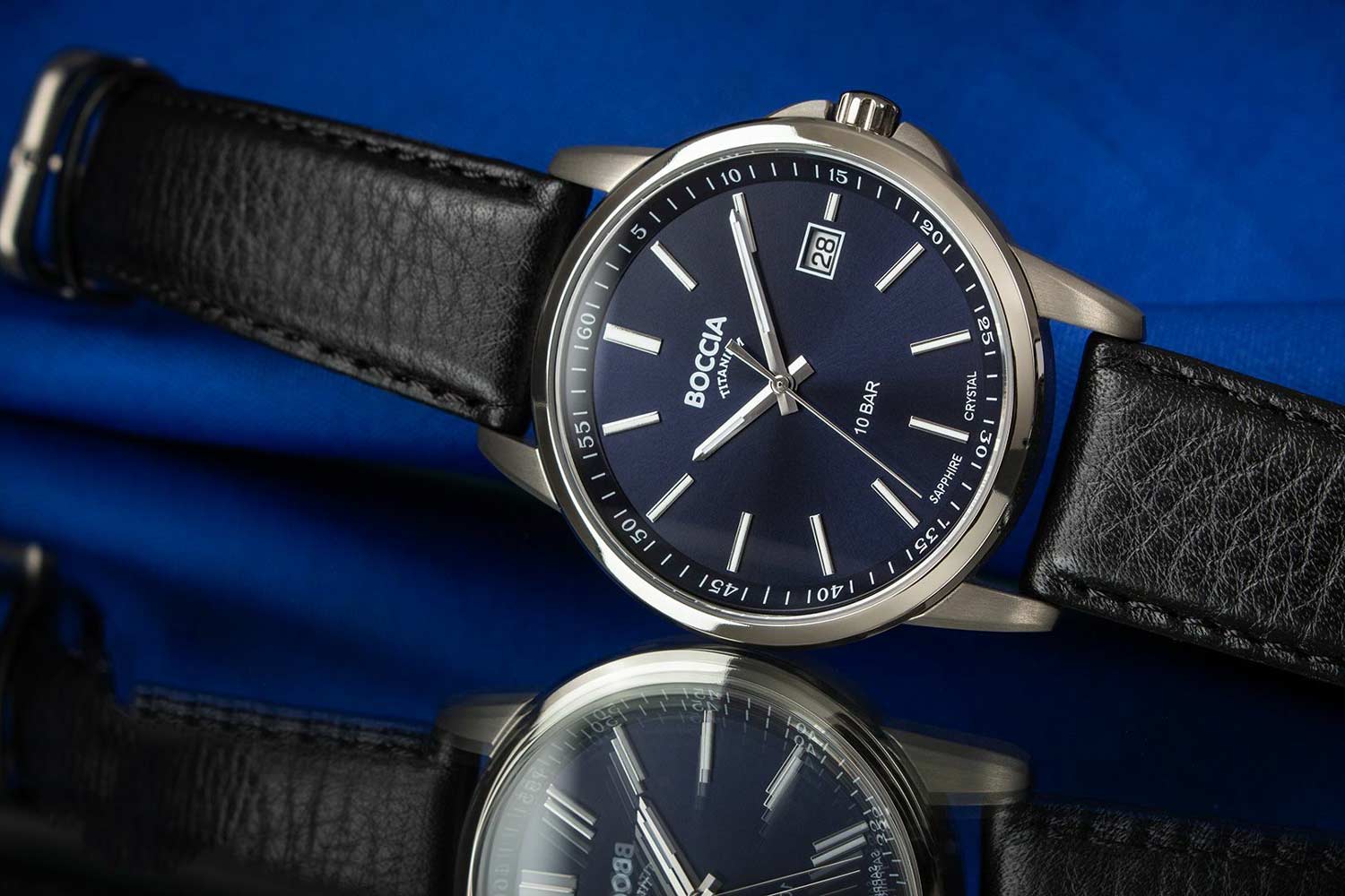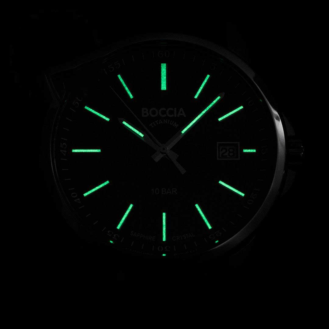 Мужские немецкие титановые часы Boccia Titanium 3633-01, кварцевый механизм с высокой точностью. Минеральное стеклоМинеральное стеклоМинеральное стекло представляет собой искусственно выращенный минерал кварца. Такое стекло отличается особой устойчивостью к повреждениям и царапинам. Уступает по некоторым качествам сапфировому стеклу. устойчивое к появлению царапин, обладающее высокой прозрачностью. Корпус изготовлен из титана. Класс водозащиты: 100 метров, позволит плавать, нырять и заниматься другими водными видами спорта. Кожаный ремешок на стандартной застёжке. Стрелки и метки с люминесцентным покрытиемЛюминесцентное покрытиеПозволяет считывать показания времени в темноте. Производители наносят на стрелки, часовые индексы, безель или поверхность циферблата светонакопительный состав, дающий холодное свечение..