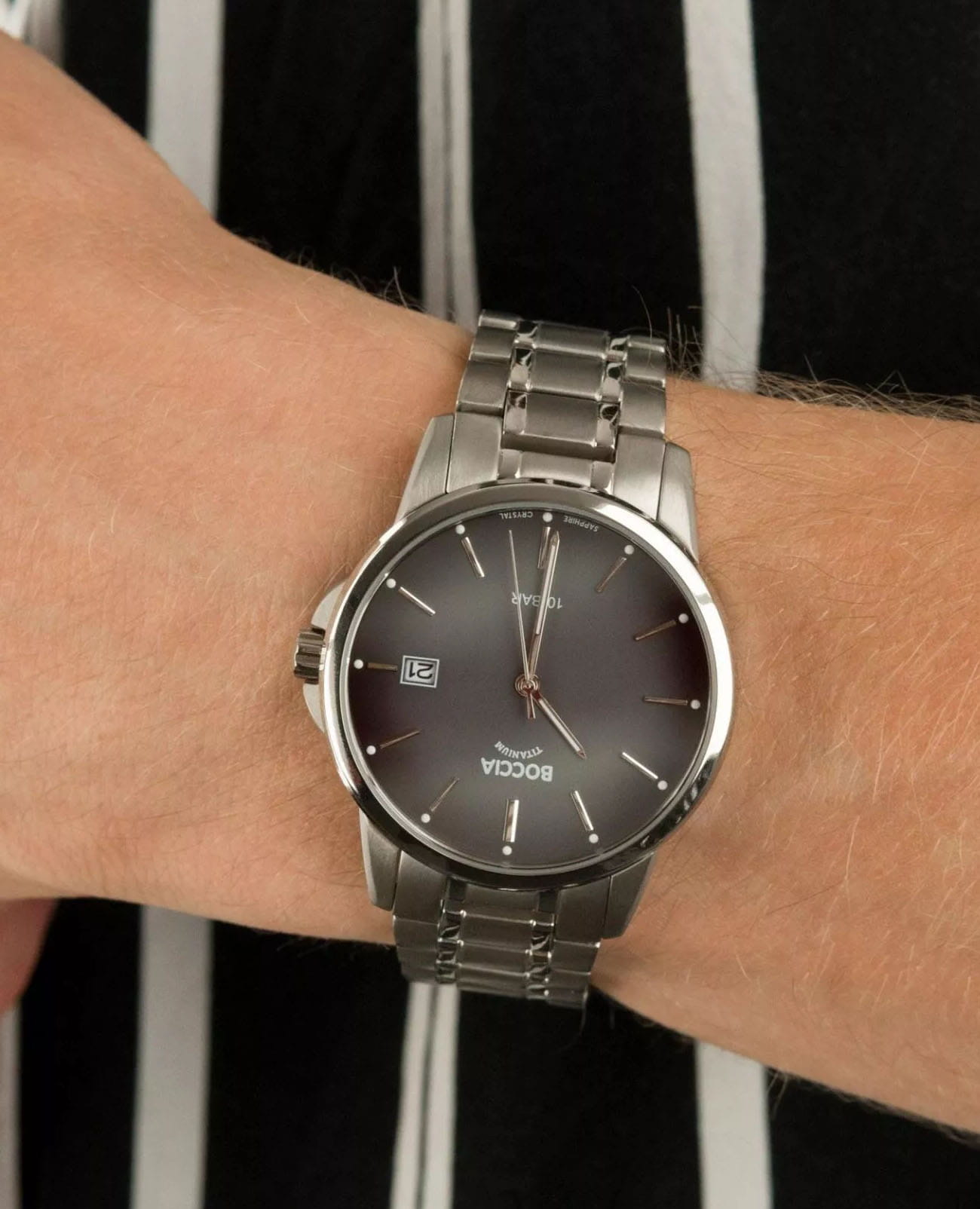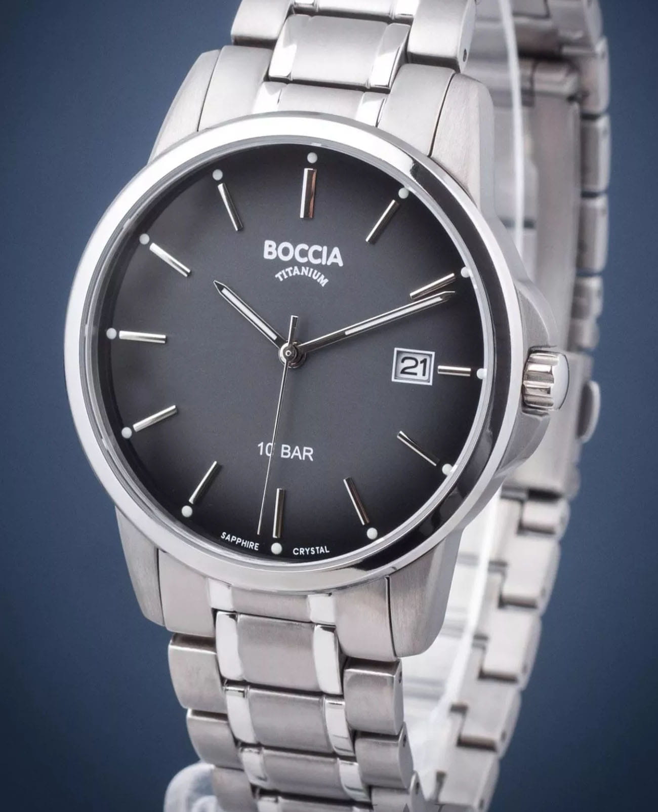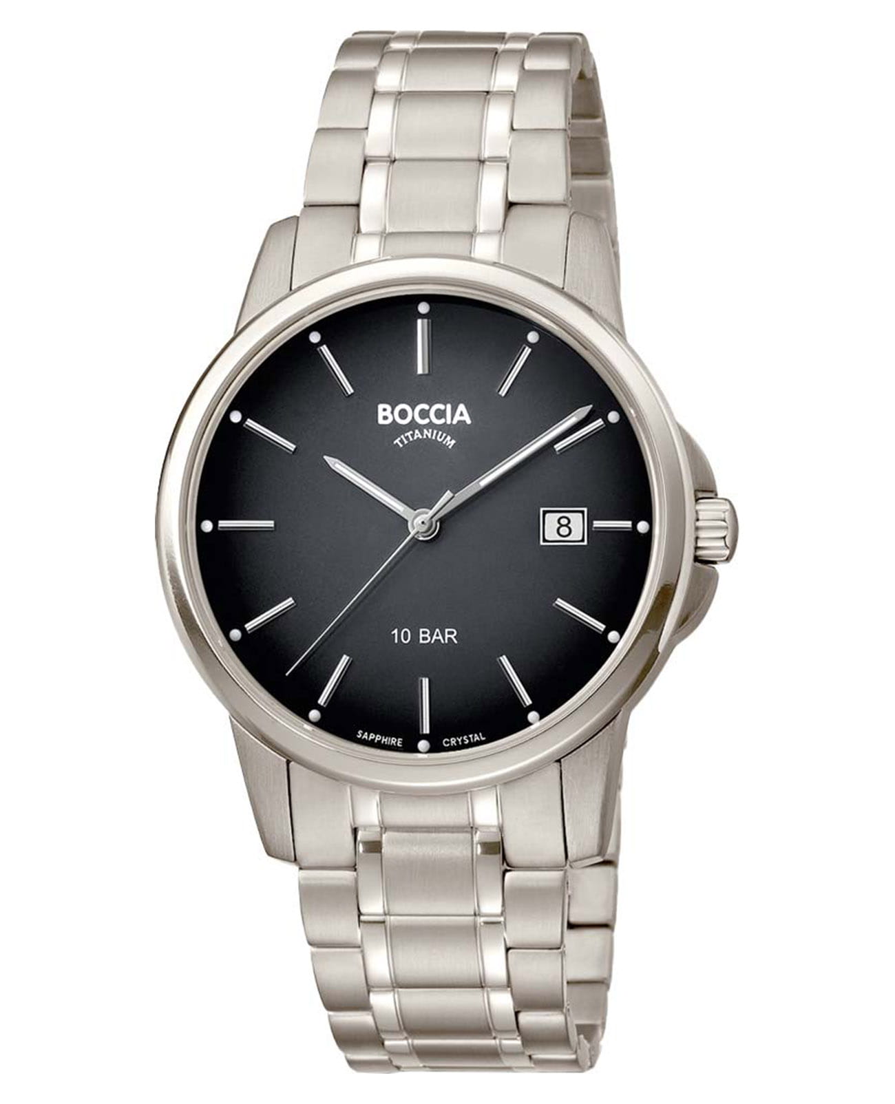 Мужские немецкие титановые часы Boccia Titanium Circle-Oval 3633-07, кварцевый механизм с высокой точностью. Сапфировое стеклоСапфировое стеклоПрочный и надёжный материал из кристалла сапфира синтетического происхождения, характеризующийся особой твёрдостью и устойчивостью к царапинам и повреждениям. устойчивое к появлению царапин, обладающее высокой прозрачностью. Корпус изготовлен из титана. Стрелки с люминесцентным покрытиемЛюминесцентное покрытиеПозволяет считывать показания времени в темноте. Производители наносят на стрелки, часовые индексы, безель или поверхность циферблата светонакопительный состав, дающий холодное свечение.. Окошко даты в положении 3 часов. Класс водозащиты: 100 метров, позволит плавать, нырять и заниматься другими водными видами спорта. Браслет из титана на раскладной застёжкеРаскладная застёжкаТакой тип застёжки используется только на браслетах из металла. Она никогда не раскрывается полностью, происходит разделение на 2 и более частей. Раскладывающая застёжка снизит вероятность потери часов к минимуму..