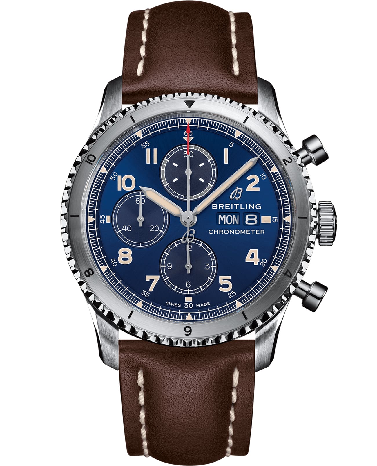 Модель Aviator 8 Chronograph 43 оснащена 30-минутным и 12-часовым счетчиками, расположенными в положении «12» и «6 часов», а также малой секундной стрелкой в положении «9 часов». Уровень точности достигает 1/4 секунды.
