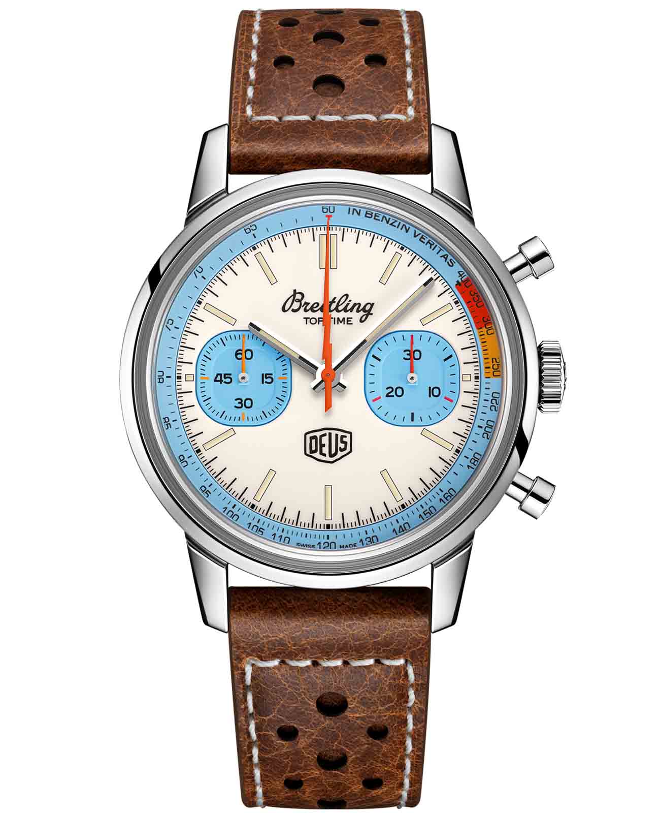 Лимитированные швейцарские унисекс часы-хронографХронографФункция позволяет измерять отрезки времени с особой точностью: часы, минуты, секунды. Верным признаком хронографа является наличие на циферблате 3 дополнительных окошек-счётчиков. Breitling Top Time Deus Limited Edition A233112A1A1X1, механический механизм (автоматический калибр) с высокой точностью. Часы Top Time Deus, разработанные совместно с австралийским брендом Deus Ex Machina, специализирующимся на мотоциклах и снаряжении для серфинга, являются отсылкой к оригинальным часам Breitling 1960-х годов и настоящей данью духу кочевников. Сапфировое стеклоСапфировое стеклоПрочный и надёжный материал из кристалла сапфира синтетического происхождения, характеризующийся особой твёрдостью и устойчивостью к царапинам и повреждениям. устойчивое к появлению царапин, обладающее высокой прозрачностью. Класс водозащиты: 30 метров, позволит защитить корпус от случайных брызг или капель дождя. Часы Top Time Deus с 41-миллиметровым корпусом из нержавеющей стали и коричневым ремешком из телячьей кожи в гоночной тематике отличаются желтыми и оранжевыми деталями, стрелкой хронографа в форме молнии поверх круглых счетчиков хронографа, надписью Deus “In benzin veritas” и ретро-дизайном. На задней крышке выгравирован "мотоциклист в режиме раллийного гонщика" от креативного директора Deus Кэрби Таквелла. Эта модель, выпущенная ограниченным тиражом в 2000 экземпляров, оснащена хронометром Breitling Caliber 23, сертифицированным COSCСертификат COSCОфициальный сертификат, подтверждающий то, что часы ходят с особо высокой точностью. Для получения документа часы подвергаются тестовым испытаниям, разработанным швейцарским институтом тестирования хронометров COSC. Допустимая норма для механических часов -4/+6 секунд в день, для кварцевых моделей +/- 0,07 секунд в день..