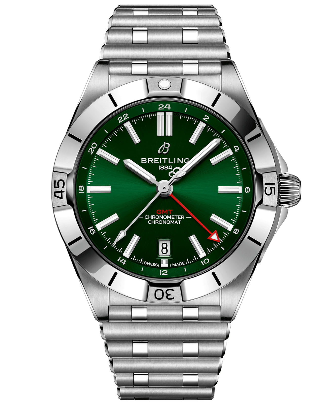 Мужские швейцарские часы Breitling Chronomat Automatic GMT 40 A32398101L1A1, механический механизм (автоматический калибр) с высокой точностью. Сапфировое стеклоСапфировое стеклоПрочный и надёжный материал из кристалла сапфира синтетического происхождения, характеризующийся особой твёрдостью и устойчивостью к царапинам и повреждениям. устойчивое к появлению царапин, обладающее высокой прозрачностью. Класс водозащиты: 200 метров, позволит плавать, нырять и заниматься другими водными видами спорта. Корпус часов изготовлен из стали. Стальной браслет с застёжкой-бабочкой с кнопкамиЗастёжка "бабочка"Такой вид застёжки дополняется предохранителями, помогающими избежать случайного раскрытия браслета. Обладают изящным исполнением. . Стрелки и метки с люминесцентным покрытиемЛюминесцентное покрытиеПозволяет считывать показания времени в темноте. Производители наносят на стрелки, часовые индексы, безель или поверхность циферблата светонакопительный состав, дающий холодное свечение.. Часы имеют сертификат COSCСертификат COSCОфициальный сертификат, подтверждающий то, что часы ходят с особо высокой точностью. Для получения документа часы подвергаются тестовым испытаниям, разработанным швейцарским институтом тестирования хронометров COSC. Допустимая норма для механических часов -4/+6 секунд в день, для кварцевых моделей +/- 0,07 секунд в день.. Окошко даты находится в положении 6 часов.