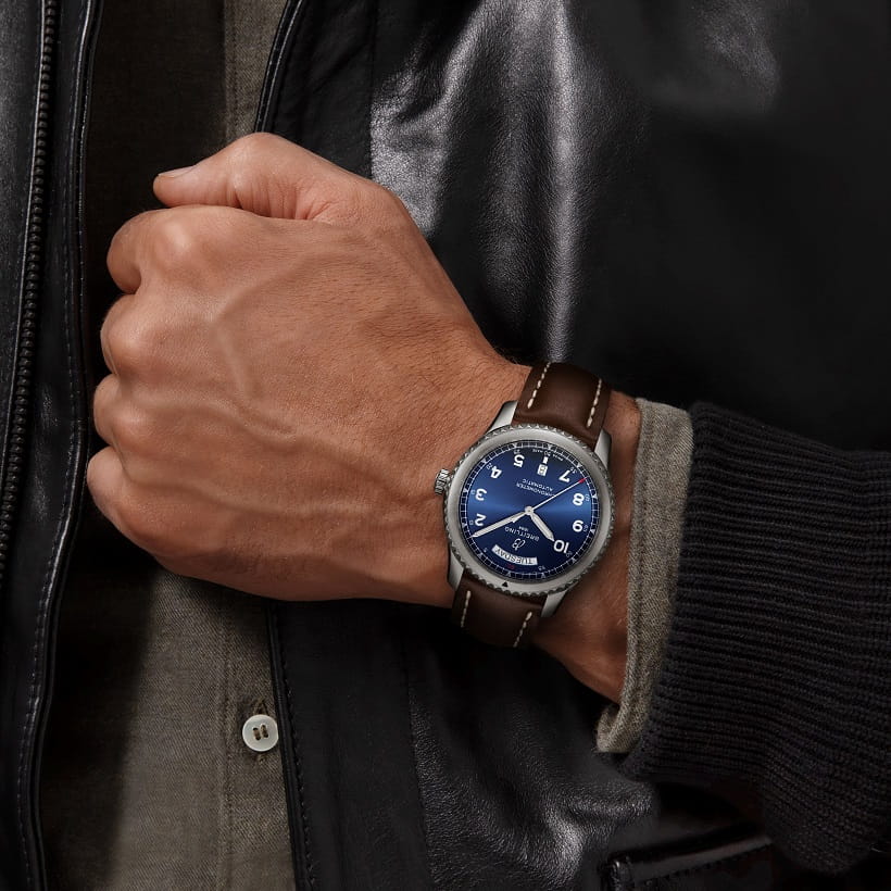Модель Aviator 8 Automatic Day & Date 41 A45330101C1X6 отображает день недели, дату и время. Индикатор дня недели размещен в положении «12 часов» симметрично дате, в положении «6 часов». «Сердцем» модели этих автоматических наручных часов является калибр Breitling Caliber 45, а двунаправленный ротор автоподзавода обеспечивает запас хода свыше 40 часов.