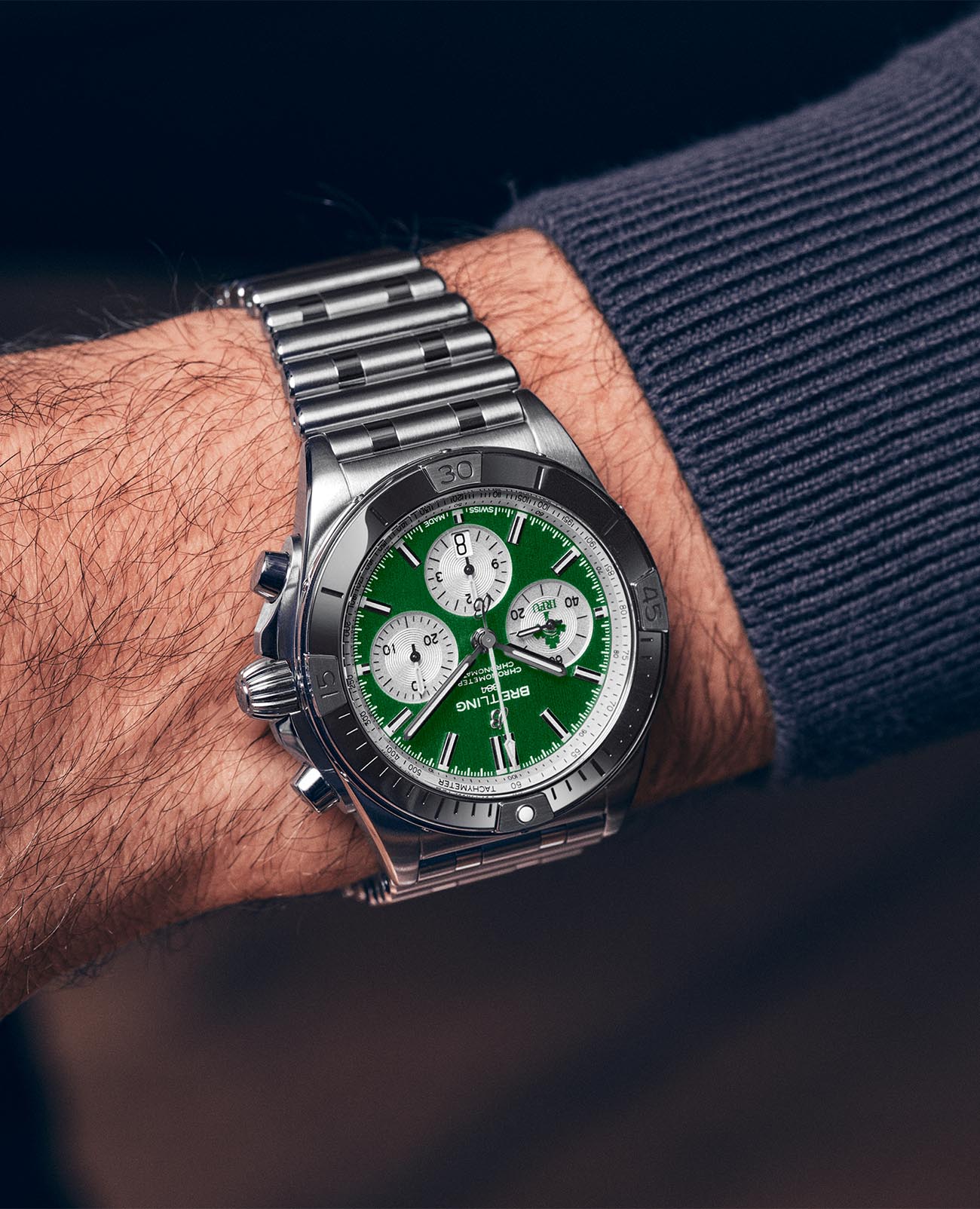 Лимитированные мужские швейцарские часы-хронографХронографФункция позволяет измерять отрезки времени с особой точностью: часы, минуты, секунды. Верным признаком хронографа является наличие на циферблате 3 дополнительных окошек-счётчиков. с секундомеромСекундомерСекундоме́р — прибор, способный измерять интервалы времени с точностью до долей секунды. Breitling Chronomat B01 42 Ireland AB0134A91L1A1, механический механизм (автоматический калибр) с высокой точностью. Основанный на хронографе Frecce Tricolori, который был разработан и выпущен в 1983 году в сотрудничестве со знаменитой итальянской авиационной эскадрильей, Chronomat стильно отпраздновал столетие Breitling и ознаменовал возвращение механическому хронографу его законного места в бренде, который построил свою мировую репутацию на этих невероятных часах. Сапфировое стеклоСапфировое стеклоПрочный и надёжный материал из кристалла сапфира синтетического происхождения, характеризующийся особой твёрдостью и устойчивостью к царапинам и повреждениям. устойчивое к появлению царапин, обладающее высокой прозрачностью. Класс водозащиты: 200 метров, позволит плавать, нырять и заниматься другими водными видами спорта. Корпус и браслет часов изготовлены из нержавеющей стали. Часы имеют сертификат COSCСертификат COSCОфициальный сертификат, подтверждающий то, что часы ходят с особо высокой точностью. Для получения документа часы подвергаются тестовым испытаниям, разработанным швейцарским институтом тестирования хронометров COSC. Допустимая норма для механических часов -4/+6 секунд в день, для кварцевых моделей +/- 0,07 секунд в день.. Стрелки и метки с люминесцентным покрытиемЛюминесцентное покрытиеПозволяет считывать показания времени в темноте. Производители наносят на стрелки, часовые индексы, безель или поверхность циферблата светонакопительный состав, дающий холодное свечение.. Шкала тахиметраТахиметрРазмеченная шкала, располагается на ободке или безеле часов. Тахиметр позволяет рассчитать скорость на определённом участке пути, расстояние измеряется в километрах или милях. на циферблате. Окошко даты находится в положении 6 часов. Браслет с застёжкой-бабочкой с кнопкамиЗастёжка "бабочка"Такой вид застёжки дополняется предохранителями, помогающими избежать случайного раскрытия браслета. Обладают изящным исполнением. .