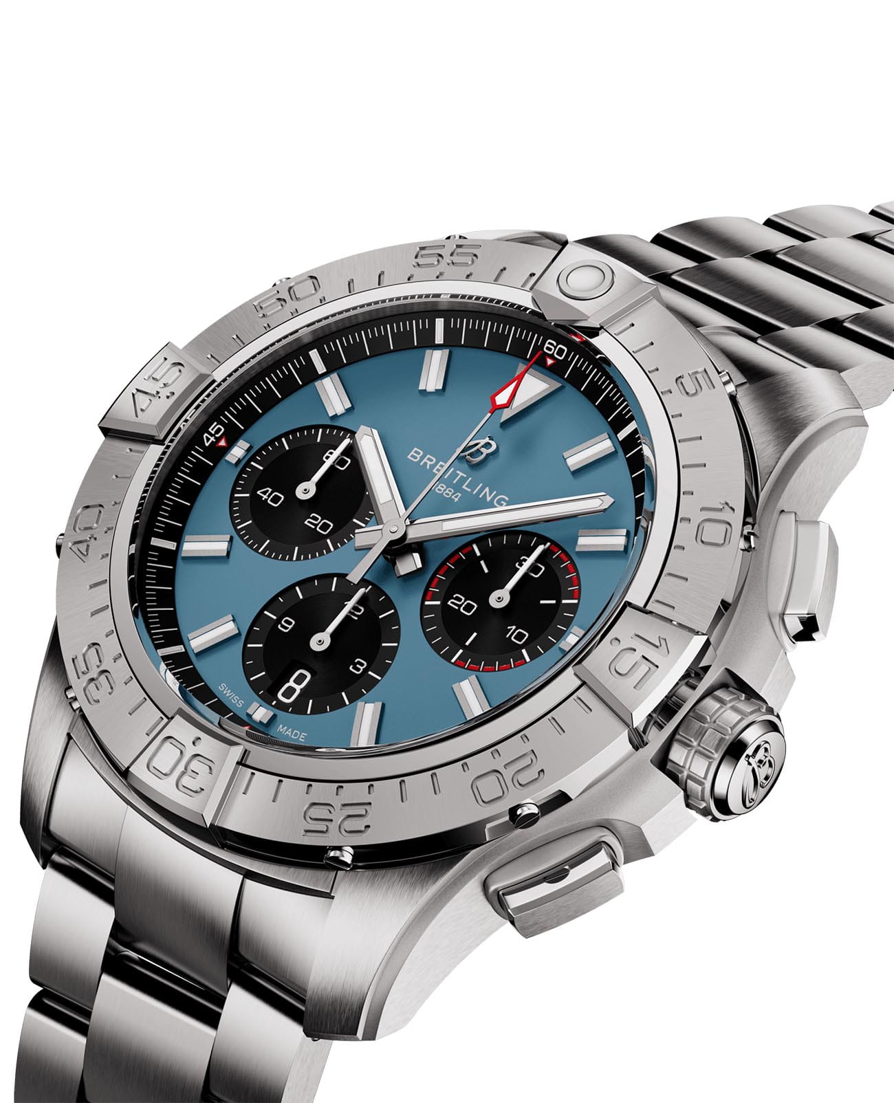 Мужские наручные часы c хронографомХронографФункция позволяет измерять отрезки времени с особой точностью: часы, минуты, секунды. Верным признаком хронографа является наличие на циферблате 3 дополнительных окошек-счётчиков. Breitling Avenger B01 Chronograph 44 AB0147101C1A1 с надёжным автоматическим механизмом. Корпус часов изготовлен из нержавеющей стали. Сапфировое стеклоСапфировое стеклоПрочный и надёжный материал из кристалла сапфира синтетического происхождения, характеризующийся особой твёрдостью и устойчивостью к царапинам и повреждениям. с антибликовым покрытием, устойчивое к мелким механическим повреждениям. Стальной браслет с раскладной застёжкойРаскладная застёжкаТакой тип застёжки используется только на браслетах из металла. Она никогда не раскрывается полностью, происходит разделение на 2 и более частей. Раскладывающая застёжка снизит вероятность потери часов к минимуму.. Стрелки и метки с люминесцентным покрытиемЛюминесцентное покрытиеПозволяет считывать показания времени в темноте. Производители наносят на стрелки, часовые индексы, безель или поверхность циферблата светонакопительный состав, дающий холодное свечение.. Однонаправленный безельБезельВнешний ободок, закрепляющий стекло. В спортивных часах так называется поворотное кольцо с делениями на циферблате, выполняет роль таймера – замеряет отрезки времени на шкале. Неподвижный безель – элемент декора. Однонаправленно вращающийся безель на дайверских часах позволяет фиксировать моменты погружения и выныривания на поверхность.. Класс водозащиты: 300 метров, позволит плавать, нырять и заниматься другими водными видами спорта.