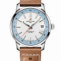 Breitling Top Time B31 AB3113281A1X1 — новаторская модель 2025 года, выполненная в духе ретро-дизайна и оснащённая новым автоматическим механизмом собственного производства. Корпус диаметром 38 мм изготовлен из нержавеющей стали с полированной отделкой. Задняя крышка с винтовым креплением и прозрачным окном демонстрирует работу калибра. Циферблат защищён выпуклым сапфировым стекломСапфировое стеклоПрочный и надёжный материал из кристалла сапфира синтетического происхождения, характеризующийся особой твёрдостью и устойчивостью к царапинам и повреждениям. с двухсторонним антибликовым покрытиемАнтибликовое покрытиеСлой оксида металла в 0,13-0,3 микрон, благодаря которому стекло часов не бликует и не отражает свет. Антибликовое покрытие уменьшает отражение света в 10 раз, обеспечивая отличную читаемость показателей циферблата.. Белый циферблат с бирюзовым внутренним кольцом оформлен в стиле классических приборных панелей. Часовые метки и стрелки покрыты люминесцентным покрытиемЛюминесцентное покрытиеПозволяет считывать показания времени в темноте. Производители наносят на стрелки, часовые индексы, безель или поверхность циферблата светонакопительный состав, дающий холодное свечение., обеспечивая читаемость при любом освещении. Внутри установлен новый автоматический калибр Breitling B31, отображающий часы, минуты и малую секундную стрелку. Запас хода составляет до 78 часов, а частота — 28 800 полуколебаний в час. Модель укомплектована перфорированным кожаным ремешком бежевого цвета с классической застёжкой-пряжкой. Водонепроницаемость 100 метров делает часы практичным выбором для повседневной активности. Top Time B31 AB3113281A1X1 — утончённый стиль, высокоточная механика и характерная винтажная подача в современной интерпретации.