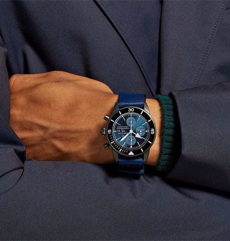 Модель Superocean Héritage II Chronograph 44 Outerknown выпущена в ознаменование уникального сотрудничества часовой компании Breitling и производителя одежды из экологических материалов Outerknown (один из основателей знаменитого бренда − легенда серфинга Келли Слейтер).