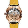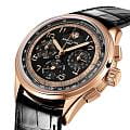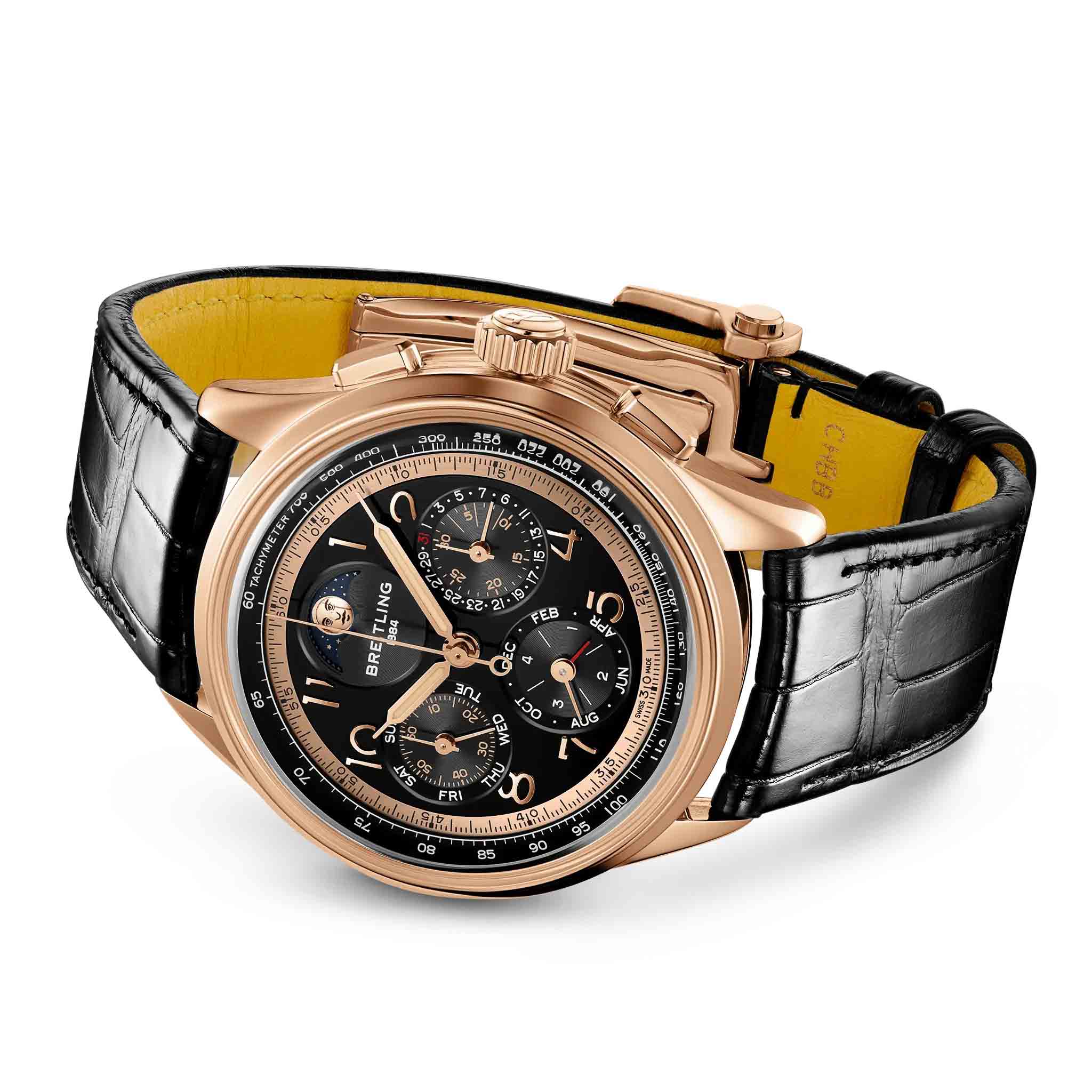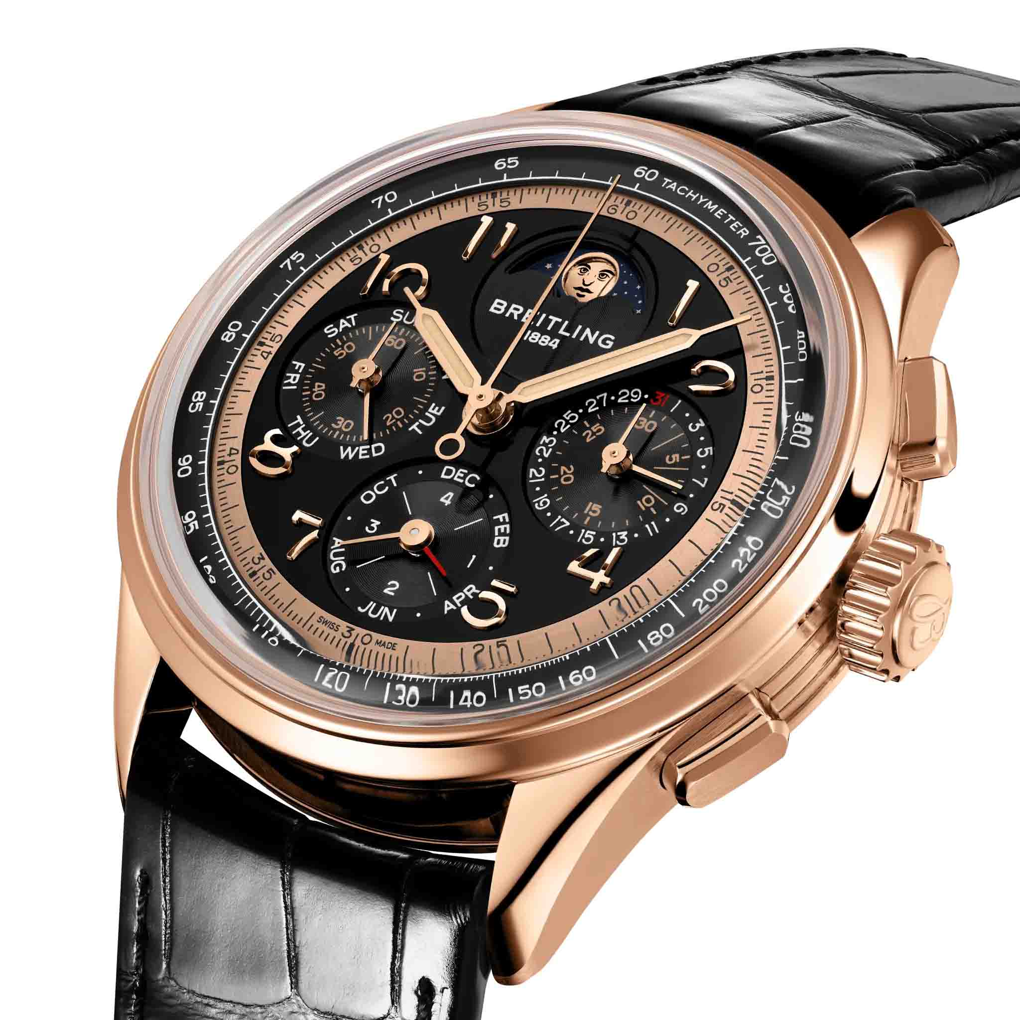 Мужские механические часы Breitling Premier RB19401A1B1P1 — это роскошный аксессуар, сочетающий в себе классический стиль и передовые технологии. Модель выполнена из 18-каратного красного золота с диаметром корпуса 42 мм и толщиной 15,6 мм, что делает её прочной и устойчивой к царапинам. Циферблат черного цвета дополнен индикатором фаз Луны, а его поверхность защищена выпуклым сапфировым стекломСапфировое стеклоПрочный и надёжный материал из кристалла сапфира синтетического происхождения, характеризующийся особой твёрдостью и устойчивостью к царапинам и повреждениям. с двусторонним антибликовым покрытиемАнтибликовое покрытиеСлой оксида металла в 0,13-0,3 микрон, благодаря которому стекло часов не бликует и не отражает свет. Антибликовое покрытие уменьшает отражение света в 10 раз, обеспечивая отличную читаемость показателей циферблата., устойчивым к повреждениям. Стрелки оснащены Люминесцентным покрытиемЛюминесцентное покрытиеПозволяет считывать показания времени в темноте. Производители наносят на стрелки, часовые индексы, безель или поверхность циферблата светонакопительный состав, дающий холодное свечение.Часы оснащены мануфактурным автоматическим механизмом Breitling Caliber 19, обеспечивающим запас хода до 96 часов и частоту колебаний 28 800 полуколебаний в час. Функции включают отображение времени,  хронографХронографФункция позволяет измерять отрезки времени с особой точностью: часы, минуты, секунды. Верным признаком хронографа является наличие на циферблате 3 дополнительных окошек-счётчиков. с точностью 1/4 секунды и временем измерения до 30 минут, а также вечный календарь с указанием фаз Луны. Водонепроницаемость позволяет плавать без, глубокого погружения Ремешок из черной кожи аллигатора шириной 22 мм оснащён раскладной застёжкойРаскладная застёжкаТакой тип застёжки используется только на браслетах из металла. Она никогда не раскрывается полностью, происходит разделение на 2 и более частей. Раскладывающая застёжка снизит вероятность потери часов к минимуму. с фиксатором, обеспечивающей комфорт и надёжную фиксацию на запястье. На задней крышке выгравирован логотип, подтверждающий уникальность изделия. Это лимитированная серия, выпущенная всего 140 экземпляров, что подчёркивает её уникальность. Гарантия 2 года подтверждает качество и долговечность изделия. Эти часы станут универсальным аксессуаром для тех, кто ценит сочетание стиля, функциональности и швейцарского мастерства — идеальный выбор для повседневной носки и торжественных случаев.