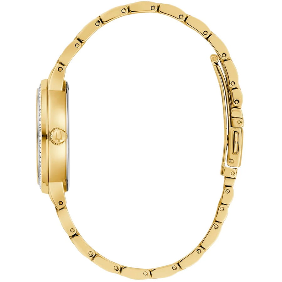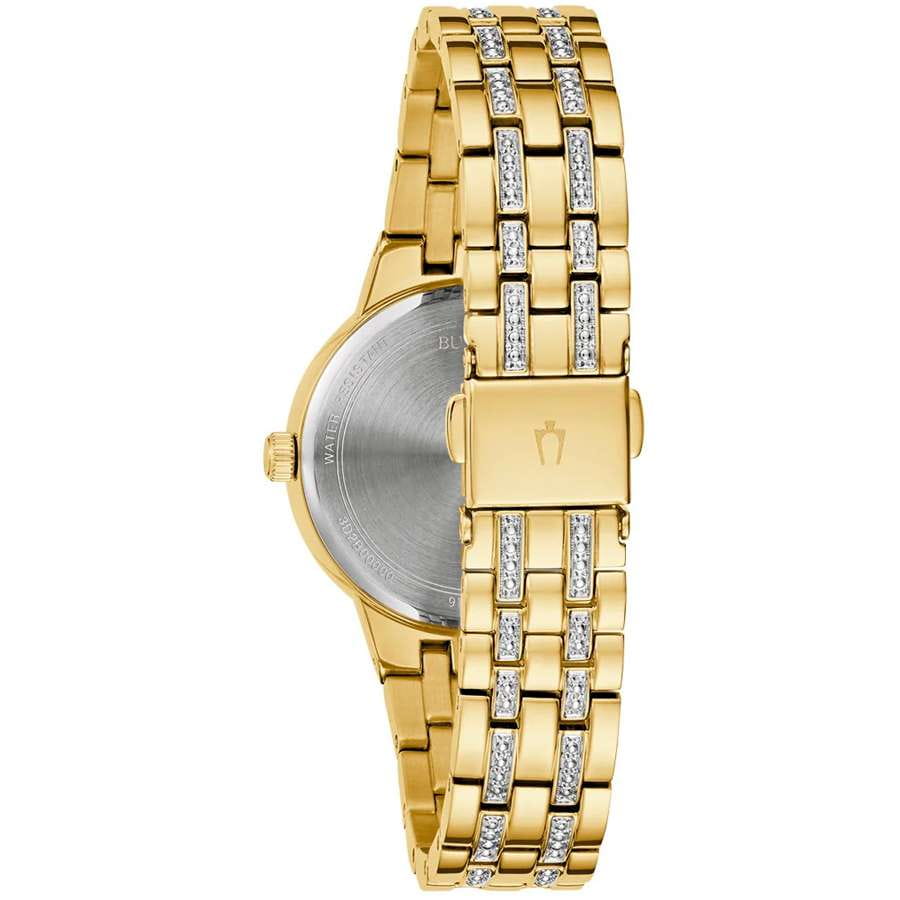 Женские кварцевые часы Bulova Crystal Ladies 97L176 – отражающий идеальное сочетание современного дизайна, надёжности и функциональности. Элегантный облик станет превосходным завершением образа, наделив его индивидуальным характером. Корпус из нержавеющей стали с IP-покрытиемIP-покрытиеМетод ионного напыления. Демонстрирует повышенную устойчивость к истиранию, окислению и химическим веществам. Под воздействием высокого давления и температуры около 1500°C молекулы металла надёжно соединяются с частицами корпуса часов., диаметром 32 мм идеально сбалансирован и элегантен. Минеральное стеклоМинеральное стеклоМинеральное стекло представляет собой искусственно выращенный минерал кварца. Такое стекло отличается особой устойчивостью к повреждениям и царапинам. Уступает по некоторым качествам сапфировому стеклу. защищает циферблат от царапин и устойчивое к мелким механическим повреждениям. БезельБезельВнешний ободок, закрепляющий стекло. В спортивных часах так называется поворотное кольцо с делениями на циферблате, выполняет роль таймера – замеряет отрезки времени на шкале. Неподвижный безель – элемент декора. Однонаправленно вращающийся безель на дайверских часах позволяет фиксировать моменты погружения и выныривания на поверхность. и браслет украшены 120 кристаллами Swarovski. Стальной браслет на раскладной застёжкеРаскладная застёжкаТакой тип застёжки используется только на браслетах из металла. Она никогда не раскрывается полностью, происходит разделение на 2 и более частей. Раскладывающая застёжка снизит вероятность потери часов к минимуму. с IP-покрытиемIP-покрытиеМетод ионного напыления. Демонстрирует повышенную устойчивость к истиранию, окислению и химическим веществам. Под воздействием высокого давления и температуры около 1500°C молекулы металла надёжно соединяются с частицами корпуса часов. обеспечивает комфортное ношение. Водозащита 30 метров позволит защитить корпус от случайных брызг или капель дождя. Эта модель – отличный выбор для тех, кто ищет сочетание стиля, качества и функциональности. Часы станут не только полезным аксессуаром, но и выразительным элементом вашего имиджа.