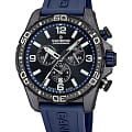 Корпус часов изготовлен из карбона, что придаёт им прочность и долговечность. Класс водозащиты 100 метров позволяет носить часы в условиях активного водного спорта, включая плавание, ныряние и другие водные виды спорта. Каучуковый ремешок на стандартной застёжке обеспечивает комфортное и надёжное крепление на запяте. Стрелки и метки с люминесцентным покрытиемЛюминесцентное покрытиеПозволяет считывать показания времени в темноте. Производители наносят на стрелки, часовые индексы, безель или поверхность циферблата светонакопительный состав, дающий холодное свечение.. Окошко даты находится в положении 6 часов.