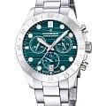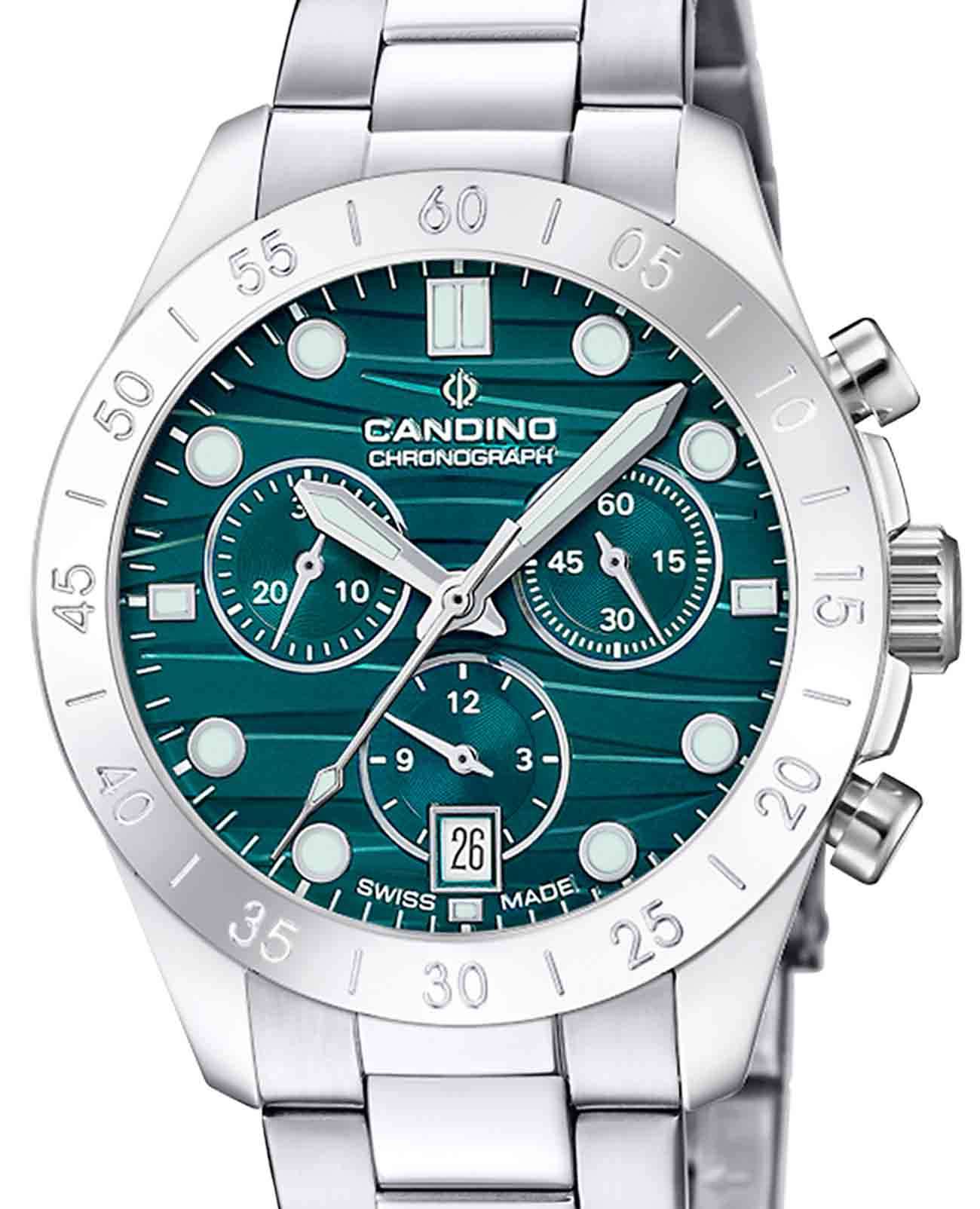 Женские часы Candino Chronos C4783/4 — сочетание элегантности и функциональности для современных женщин. Эти стильные часы-хронографХронографФункция позволяет измерять отрезки времени с особой точностью: часы, минуты, секунды. Верным признаком хронографа является наличие на циферблате 3 дополнительных окошек-счётчиков. с секундомеромСекундомерСекундоме́р — прибор, способный измерять интервалы времени с точностью до долей секунды. оснащены кварцевым механизмом, обеспечивающим точность и надежность. На безелеБезельВнешний ободок, закрепляющий стекло. В спортивных часах так называется поворотное кольцо с делениями на циферблате, выполняет роль таймера – замеряет отрезки времени на шкале. Неподвижный безель – элемент декора. Однонаправленно вращающийся безель на дайверских часах позволяет фиксировать моменты погружения и выныривания на поверхность. выгравирована секундная шкала. Сине-зеленый циферблат с функцией отображения даты в районе 6 часов добавляет модели изысканности и позволяет легко отслеживать дату. Корпус диаметром 39 мм выполнен из прочной нержавеющей стали, что гарантирует долговечность и устойчивость к внешним воздействиям. Сапфировое стеклоСапфировое стеклоПрочный и надёжный материал из кристалла сапфира синтетического происхождения, характеризующийся особой твёрдостью и устойчивостью к царапинам и повреждениям. защищает циферблат, обеспечивая высокую степень защиты от царапин и сохраняя первозданный вид часов. Стрелки и метки с люминесцентным покрытиемЛюминесцентное покрытиеПозволяет считывать показания времени в темноте. Производители наносят на стрелки, часовые индексы, безель или поверхность циферблата светонакопительный состав, дающий холодное свечение., что облегчает чтение времени даже в условиях слабого освещения. Стальной браслет на раскладной застёжкеРаскладная застёжкаТакой тип застёжки используется только на браслетах из металла. Она никогда не раскрывается полностью, происходит разделение на 2 и более частей. Раскладывающая застёжка снизит вероятность потери часов к минимуму. добавляет современный штрих и комфортно сидит на запястье, идеально подходя для повседневного ношения. С водонепроницаемостью до 100 метров эти часы подходят для активного образа жизни, позволяя не беспокоиться о случайных контактах с водой, таких как плавание или дождь.