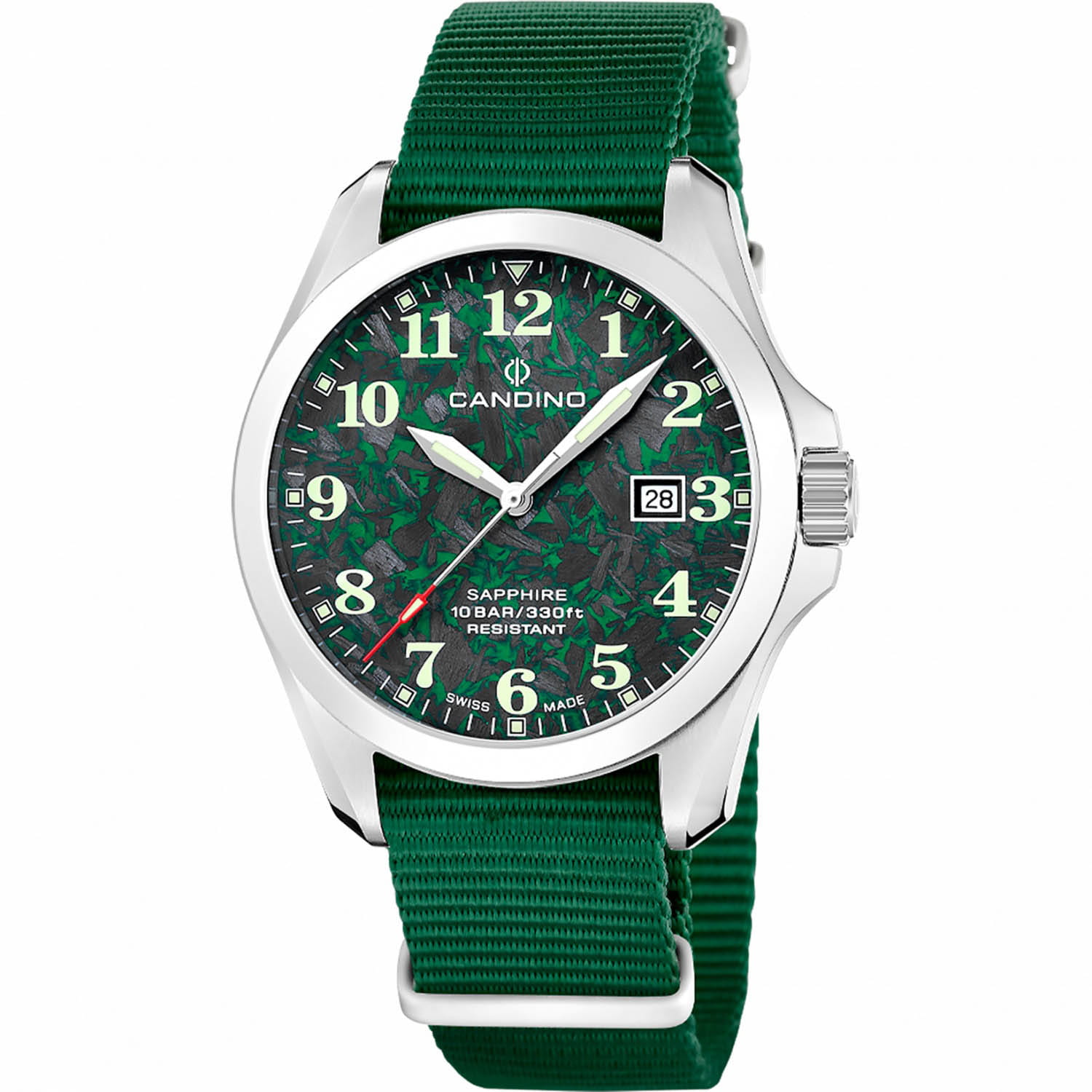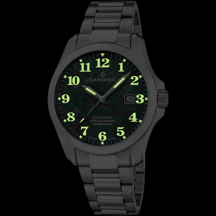 Мужские кварцевые часы Candino C4785/3 — это стильный и надёжный аксессуар швейцарского производства, сочетающий элегантность и функциональность. Корпус круглой формы выполнен из нержавеющей стали и защищён сапфировым стекломСапфировое стеклоПрочный и надёжный материал из кристалла сапфира синтетического происхождения, характеризующийся особой твёрдостью и устойчивостью к царапинам и повреждениям., устойчивым к царапинам. Циферблат зелёного цвета оформлен штрихами в качестве индикации, а стрелки и метки оснащены люминесцентным покрытиемЛюминесцентное покрытиеПозволяет считывать показания времени в темноте. Производители наносят на стрелки, часовые индексы, безель или поверхность циферблата светонакопительный состав, дающий холодное свечение., обеспечивающим хорошую читаемость в темноте. Окошко даты расположено на отметке 3 часа, что делает часы практичными в повседневном использовании. Браслет из нержавеющей стали фиксируется на раскладной застёжкеРаскладная застёжкаТакой тип застёжки используется только на браслетах из металла. Она никогда не раскрывается полностью, происходит разделение на 2 и более частей. Раскладывающая застёжка снизит вероятность потери часов к минимуму., обеспечивая удобство и надёжность ношения. Водонепроницаемость 50 м позволяет использовать часы в повседневных условиях, защищая от случайных брызг и капель дождя. Модель подчёркивает индивидуальность и хороший вкус владельца, оставаясь универсальным выбором для любого образа. В комплекте предусмотрены два ремешка из кожи и текстиля.