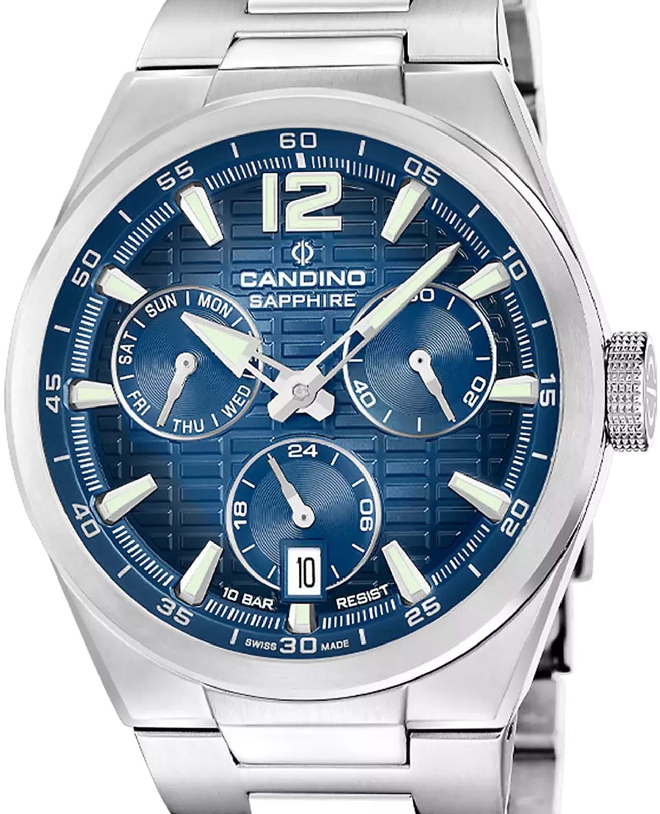 Мужские кварцевые часы Candino — это сочетание классического дизайна, надёжности и швейцарского качества. Корпус диаметром 43 мм и толщиной 11,5 мм выполнен из нержавеющей стали. Циферблат синего цвета оформлен индексами в виде штрихов и стрелками. Указатели дня недели и даты расположены в центре циферблата. Стрелки и метки с люминесцентным покрытиемЛюминесцентное покрытиеПозволяет считывать показания времени в темноте. Производители наносят на стрелки, часовые индексы, безель или поверхность циферблата светонакопительный состав, дающий холодное свечение., обеспечивающим хорошую читаемость в темноте. Циферблат защищён сапфировым стекломСапфировое стеклоПрочный и надёжный материал из кристалла сапфира синтетического происхождения, характеризующийся особой твёрдостью и устойчивостью к царапинам и повреждениям., устойчивым к царапинам. Механизм — кварцевый произведённый в Швейцарии. Часы оснащены стальным браслетом с раскладной застёжкойРаскладная застёжкаТакой тип застёжки используется только на браслетах из металла. Она никогда не раскрывается полностью, происходит разделение на 2 и более частей. Раскладывающая застёжка снизит вероятность потери часов к минимуму.. Водонепроницаемость 100 м позволяет использовать часы для плавания и повседневного ношения. Гарантия — 2 года. Идеальный выбор для тех, кто ценит стиль, функциональность и точность.
