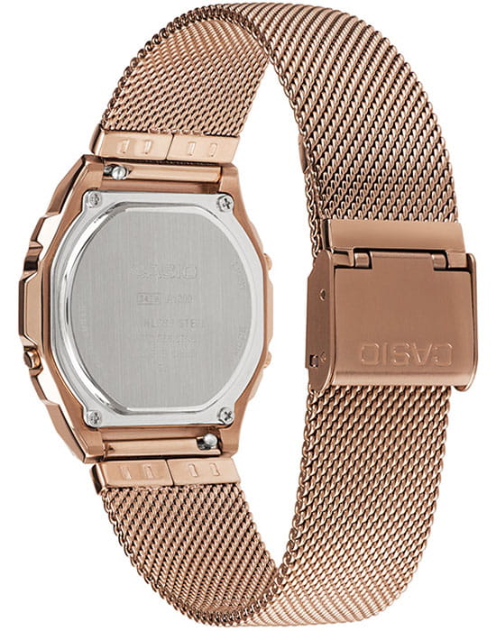 Уже известный 8-угольный ударопрочный корпусУдаропрочный корпусМеханизм заключён в корпус, выполненный из современных материалов, устойчивых к ударам, механическим повреждениям и падению с высоты: инновационный пластик, карбон, нержавеющая сталь, титан. выполнен из нержавеющей стали 316L, как и стильный браслет миланского плетения. Оригинально выглядит переливающаяся вставка, окружающая цифровое окошко. Кварцевый высокоточный механизм работает от батарейки, аккумулятор рассчитан на 3 года эксплуатации. Светодиодная подсветкаСветодиодная подсветкаСветодиодная или LED-подсветка обеспечивает появление яркого холодного свечения за счёт LED-элементов - маленьких лампочек. Они потребляют минимальное количество энергии, чаще всего можно встретить 1 светодиод, в нижней части циферблата. дисплея. Долговечное IP-покрытиеIP-покрытиеМетод ионного напыления. Демонстрирует повышенную устойчивость к истиранию, окислению и химическим веществам. Под воздействием высокого давления и температуры около 1500°C молекулы металла надёжно соединяются с частицами корпуса часов. цвета розового золота. Минеральное стекло устойчиво к появлению царапин. Автоматический календарь, будильник, секундомер. Габариты: 38 x 39,6 x 7,3 мм.