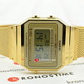 Золотистое исполнение сочетается с любой одеждой, это универсальный вариант на каждый день. Компактный корпус из полимерного пластика отлично смотрится на запястье. Модель обладает базовым функционалом: будильник, секундомер, автоматический календарь. Особый стиль придаёт браслет из нержавеющей стали 316L миланского плетения. Батарейка рассчитана на 3 года службы. Минеральное стекло препятствует образованию царапин. Габариты: 38,6 x 36,3 x 9,6 мм.