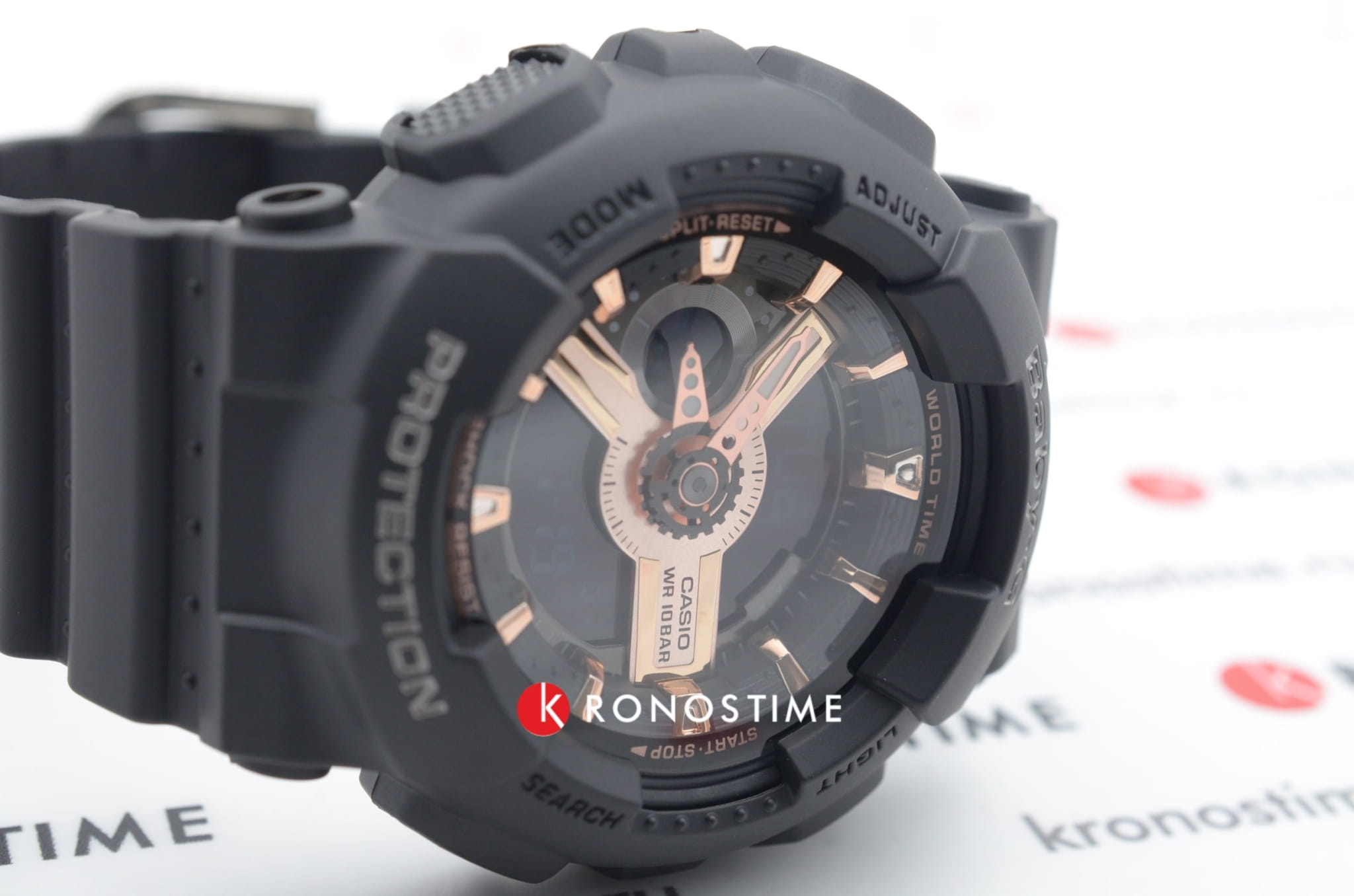 Привлекательно выглядят крупные детали в цвете розового золота. Наручные часы отличаются противоударным корпусомУдаропрочный корпусМеханизм заключён в корпус, выполненный из современных материалов, устойчивых к ударам, механическим повреждениям и падению с высоты: инновационный пластик, карбон, нержавеющая сталь, титан. из полимерного пластика, способного выдерживать повышенные нагрузки. Идентичный материал был выбран и для ремешка. Японский кварцевый механизм с точностью хода +/- 30 секунд в месяц. Срок службы аккумулятора - 2 года. Минеральное стеклоМинеральное стеклоМинеральное стекло представляет собой искусственно выращенный минерал кварца. Такое стекло отличается особой устойчивостью к повреждениям и царапинам. Уступает по некоторым качествам сапфировому стеклу., устойчивое к появлению царапин. Светодиодная подсветкаСветодиодная подсветкаСветодиодная или LED-подсветка обеспечивает появление яркого холодного свечения за счёт LED-элементов - маленьких лампочек. Они потребляют минимальное количество энергии, чаще всего можно встретить 1 светодиод, в нижней части циферблата. циферблата. Водозащита 100 метров. Возможность включения и выключения звука кнопок. ХронографХронографФункция позволяет измерять отрезки времени с особой точностью: часы, минуты, секунды. Верным признаком хронографа является наличие на циферблате 3 дополнительных окошек-счётчиков., секундомерСекундомерСекундоме́р — прибор, способный измерять интервалы времени с точностью до долей секунды. с точностью в 1/100 секунды, таймерТаймерОтсчитывает секунды в обратном направлении в заданном интервале времени., мировое времяМировое время Полезное часовое усложнение, отображающее время в основных городах и известных областях по всему миру, оно связано с часовыми поясами, удобно для путешественников и бизнесменов. 29 часовых поясов, будильникБудильникБуди́льник — часы, в заданный момент времени подающие звуковой, световой и/или в редких случаях другой сигнал., UTCUTCВсемирное кординационное время, не имеющее привязки к географическому положению Гринвича, основывается на атомном отсчёте времени. Регулировка времени осуществляется более точно, чем устаревшее GMT.