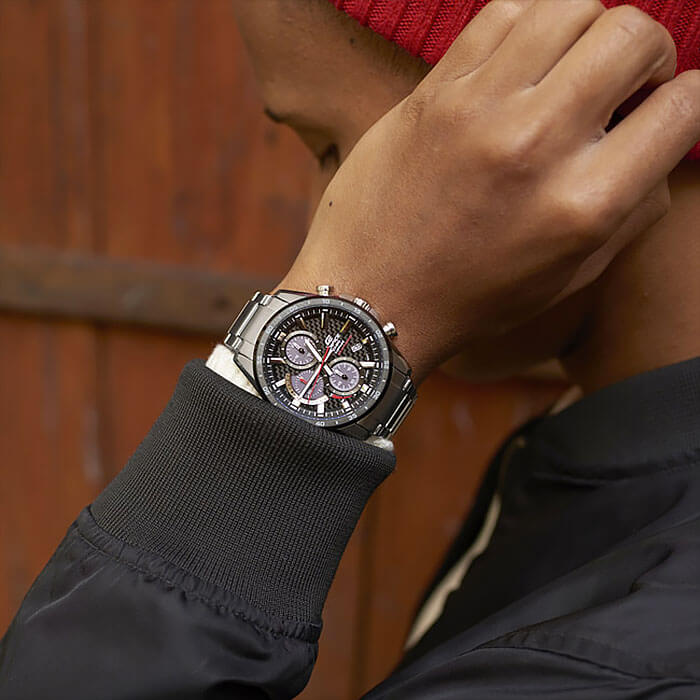 Габаритные наручные часы станут ключевой деталью для повседневного образа, привлекательно выглядят элементы красного цвета. Интерес вызывает необычный тёмный циферблат, имеющий карбоновую текстуру, переплетённые волокна образуют оригинальный узор. Ударопрочный корпусУдаропрочный корпусМеханизм заключён в корпус, выполненный из современных материалов, устойчивых к ударам, механическим повреждениям и падению с высоты: инновационный пластик, карбон, нержавеющая сталь, титан. и браслет на раскладной застёжкеРаскладная застёжкаТакой тип застёжки используется только на браслетах из металла. Она никогда не раскрывается полностью, происходит разделение на 2 и более частей. Раскладывающая застёжка снизит вероятность потери часов к минимуму. сделаны из стали 316L с антикоррозионными свойствами, за счёт чего часы надолго сохранят безупречный внешний вид. Модель получает питание от солнечного света Tough SolarTough SolarТехнология основана на подзарядке аккумулятора от источника солнечного света, специальная панель улавливает солнечные лучи и преобразует их в энергию для работы часов. Достаточно пары минут нахождения на солнце для функционирования часов в течении суток., состояние заряда можно отслеживать благодаря наличию особого индикатора. БезельБезельВнешний ободок, закрепляющий стекло. В спортивных часах так называется поворотное кольцо с делениями на циферблате, выполняет роль таймера – замеряет отрезки времени на шкале. Неподвижный безель – элемент декора. Однонаправленно вращающийся безель на дайверских часах позволяет фиксировать моменты погружения и выныривания на поверхность. с чёрным IP-покрытиемIP-покрытиеМетод ионного напыления. Демонстрирует повышенную устойчивость к истиранию, окислению и химическим веществам. Под воздействием высокого давления и температуры около 1500°C молекулы металла надёжно соединяются с частицами корпуса часов.. Закручивающаяся крышка с резьбовым соединением. Водонепроницаемость 100 метров. Подсветка NeobriteПодсветка NeobriteИспользование светонакопительных составов на основе сульфида цинка или алюмината стронция, яркий свет можно наблюдать на протяжении 6-10 часов после «зарядки» часов около источника света.. Сапфировое стеклоСапфировое стеклоПрочный и надёжный материал из кристалла сапфира синтетического происхождения, характеризующийся особой твёрдостью и устойчивостью к царапинам и повреждениям.. Часы-хронографХронографФункция позволяет измерять отрезки времени с особой точностью: часы, минуты, секунды. Верным признаком хронографа является наличие на циферблате 3 дополнительных окошек-счётчиков. с секундомеромСекундомерСекундоме́р — прибор, способный измерять интервалы времени с точностью до долей секунды. с точностью показаний 1с и временем измерения 30мин. Габариты: 51,5 x 47,6 x 12 мм.