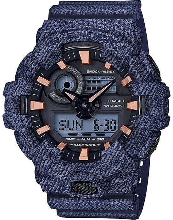 Аналого-цифровые часы отличаются джинсовым принтом в стиле уличной моды, циферблат дополнен контрастными элементами, аксессуар является выгодным завершением образа. Модель имеет противоударный корпусУдаропрочный корпусМеханизм заключён в корпус, выполненный из современных материалов, устойчивых к ударам, механическим повреждениям и падению с высоты: инновационный пластик, карбон, нержавеющая сталь, титан. из полимерного пластика, устойчивого к максимальным нагрузкам. Японский кварцевый механизм. Аккумулятор рассчитан на 5 лет работы. Включение и отключение звука кнопок. Светодиодная LED-подсветкаСветодиодная подсветкаСветодиодная или LED-подсветка обеспечивает появление яркого холодного свечения за счёт LED-элементов - маленьких лампочек. Они потребляют минимальное количество энергии, чаще всего можно встретить 1 светодиод, в нижней части циферблата., кнопка активации для удобства вынесена в нижнюю часть. Водозащита 200 метров. Минеральное стекло. Функция мирового времениМировое время Полезное часовое усложнение, отображающее время в основных городах и известных областях по всему миру, оно связано с часовыми поясами, удобно для путешественников и бизнесменов. , таймер с автоповтором, UTCUTCВсемирное кординационное время, не имеющее привязки к географическому положению Гринвича, основывается на атомном отсчёте времени. Регулировка времени осуществляется более точно, чем устаревшее GMT.