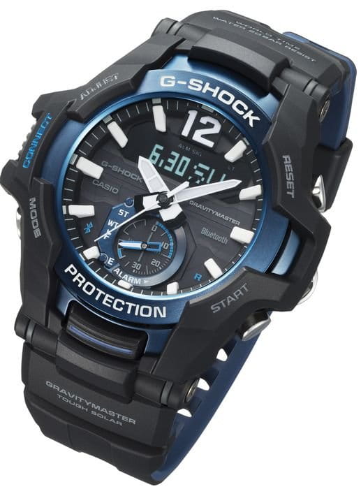 Наручные часы являются представителем линейки Gravitymaster, дисплей чем-то напоминает кабину пассажирского самолёта. Особенностью аксессуара стал цифровой дисплей с самым высоким разрешением среди G-Shock, что появилось за счёт внедрения технологии STN. Это позволило добиться широкоугольного обзора и улучшить читаемость циферблата. Также интерес привлекает модифицированный таймер, где можно установить число, месяц или год, планируемому событию для удобства можно дать название. Противоударный корпусУдаропрочный корпусМеханизм заключён в корпус, выполненный из современных материалов, устойчивых к ударам, механическим повреждениям и падению с высоты: инновационный пластик, карбон, нержавеющая сталь, титан. выполнен из полимерного материала, японский кварцевый механизм с точностью хода +/- 15 секунд в месяц находится под надёжной защитой. безельБезельВнешний ободок, закрепляющий стекло. В спортивных часах так называется поворотное кольцо с делениями на циферблате, выполняет роль таймера – замеряет отрезки времени на шкале. Неподвижный безель – элемент декора. Однонаправленно вращающийся безель на дайверских часах позволяет фиксировать моменты погружения и выныривания на поверхность. из стали 316L c IP-покрытиемIP-покрытиеМетод ионного напыления. Демонстрирует повышенную устойчивость к истиранию, окислению и химическим веществам. Под воздействием высокого давления и температуры около 1500°C молекулы металла надёжно соединяются с частицами корпуса часов.. Технология . Индикатор заряда аккумулятора. Закаленное минеральное стекло. Синхронизация со смартфоном Bluetooth 4.0BluetoothСовременная технология, позволяющая синхронизировать часы с телефоном и переносить данные. Часы с Bluetooth расширяют возможности вашего смартфона и делают его использование ещё более удобным.. Водозащита 20 бар. СветодиоднаяСветодиодная подсветкаСветодиодная или LED-подсветка обеспечивает появление яркого холодного свечения за счёт LED-элементов - маленьких лампочек. Они потребляют минимальное количество энергии, чаще всего можно встретить 1 светодиод, в нижней части циферблата. и люминесцентнаяЛюминесцентное покрытиеПозволяет считывать показания времени в темноте. Производители наносят на стрелки, часовые индексы, безель или поверхность циферблата светонакопительный состав, дающий холодное свечение. подсветка. Возможности: поиск телефона, секундомер, будильник, хронографХронографФункция позволяет измерять отрезки времени с особой точностью: часы, минуты, секунды. Верным признаком хронографа является наличие на циферблате 3 дополнительных окошек-счётчиков., автоматический календарь до 2099 года, мировое времяМировое время Полезное часовое усложнение, отображающее время в основных городах и известных областях по всему миру, оно связано с часовыми поясами, удобно для путешественников и бизнесменов. , UTCUTCВсемирное кординационное время, не имеющее привязки к географическому положению Гринвича, основывается на атомном отсчёте времени. Регулировка времени осуществляется более точно, чем устаревшее GMT.