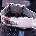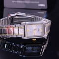Необычный дизайн наручных часов сочетает в себе серебристый и золотые цвета. Прямоугольный корпус часов сделан из гипоаллергенной латуни. Двухцветный, широкий браслет выполнен из нержавеющей стали. Поверхность браслета плавно отражает падающий цвет. Временные отметки на циферблате сочетают в себе штрихи и арабские цифры. Аксессуар имеет небольшой вес и не приносит дискомфорта своему обладателю. Водонепроницаемость часов равна WR 30.
