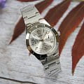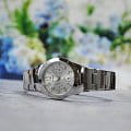 Наручные часы выполнены из такого высококачественного материала, как нержавеющая сталь. Круглый, аккуратный корпус и гладкий, серебристый браслет прочно соединены между собой. На серебристом циферблате расположены временные отметки в виде арабских цифр и штрихов. Часы надежно защищены с помощью минерального, стойкого к повреждениям стекла. На дисплее отображается текущая дата и день недели. Тип механизма - кварцевый. Срок службы батарейки составляет три года. Водонепроницаемость равна 50 WR.