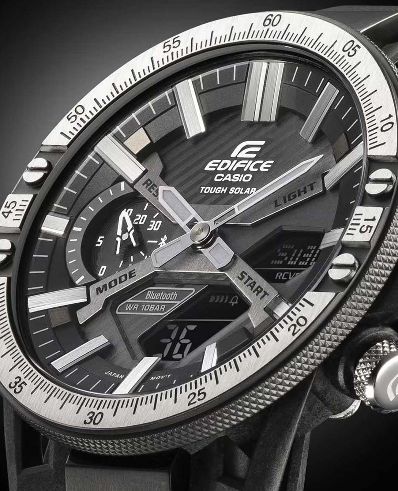 Многофункциональные японские мужские часы Casio Edifice ECB-2000TP-1A. Среди функций питание от солнечной энергии Tough SolarTough SolarТехнология основана на подзарядке аккумулятора от источника солнечного света, специальная панель улавливает солнечные лучи и преобразует их в энергию для работы часов. Достаточно пары минут нахождения на солнце для функционирования часов в течении суток., автоматическое сохранение энергии. Время работы аккумулятора без подзарядки приблизительно 7 месяцев, при включенной функции сохранения энергии приблизительно 18 месяцев. Двойная светодиодная подсветка Super Illuminator с функцией Afterglow. Цвет подсветки: белый. 12-ти и 24-х часовой формат времени. Секундомер с двумя точностями показаний: 1/100с (до 1ч) и 1с (после 1ч) и временем измерения 24ч. SPLIT-хронографСплит-хронографИспользуется для измерения продолжительности нескольких временных отрезков, начинающихся одновременно, а заканчивающихся в разное время.. ТаймерТаймерОтсчитывает секунды в обратном направлении в заданном интервале времени. обратного отсчета от 1с до 24ч. Мировое времяМировое время Полезное часовое усложнение, отображающее время в основных городах и известных областях по всему миру, оно связано с часовыми поясами, удобно для путешественников и бизнесменов. – 38 часовых поясов, всемирное координированное время (UTCUTCВсемирное кординационное время, не имеющее привязки к географическому положению Гринвича, основывается на атомном отсчёте времени. Регулировка времени осуществляется более точно, чем устаревшее GMT.