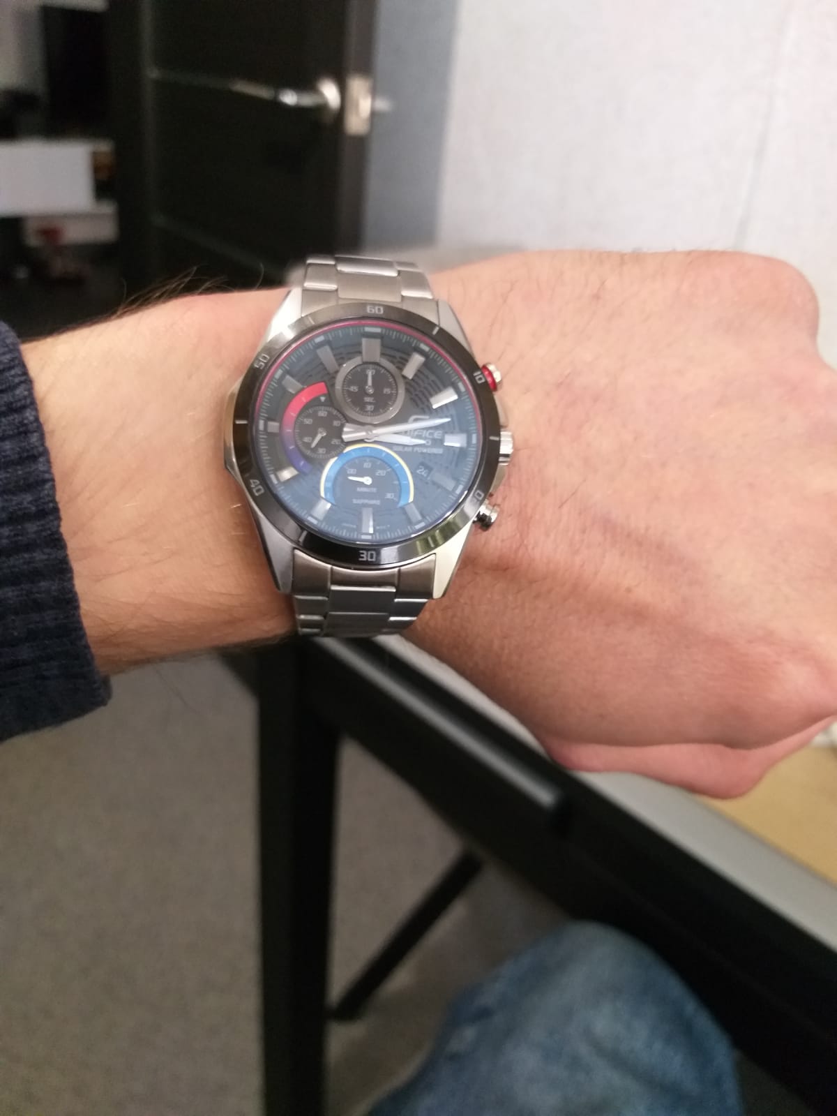 Мужские часы-хронографХронографФункция позволяет измерять отрезки времени с особой точностью: часы, минуты, секунды. Верным признаком хронографа является наличие на циферблате 3 дополнительных окошек-счётчиков. Casio Edifice EFR-571DB-1A1, кварцевый механизм с высокой точностью. Тонкий корпус толщиной менее 10 мм обеспечивает комфортную носку в любимом вами спортивном дизайне хронографа с дополнительными циферблатами. Металлический сетчатый циферблат напоминает решетку радиатора спортивного автомобиля, создавая впечатление чистой спортивной скорости, а устойчивое к царапинам сапфировое стеклоСапфировое стеклоПрочный и надёжный материал из кристалла сапфира синтетического происхождения, характеризующийся особой твёрдостью и устойчивостью к царапинам и повреждениям. обеспечивает высокую прозрачность и легкость считывания показаний. На циферблате имеется индикатор запас хода. Светонакопительное покрытие позволяет видеть время в темноте даже после непродолжительного нахождения часов на свету. Подойдут как для повседневной, так и для активной деятельности. Питание от солнечной энергии, индикатор заряда батареи. Приблизительное время автономной работы без подзарядки на свету около 6 месяцев. Долговечный стальной корпус, закрытый сапфировым стеклом с антибликовым покрытием. БезельБезельВнешний ободок, закрепляющий стекло. В спортивных часах так называется поворотное кольцо с делениями на циферблате, выполняет роль таймера – замеряет отрезки времени на шкале. Неподвижный безель – элемент декора. Однонаправленно вращающийся безель на дайверских часах позволяет фиксировать моменты погружения и выныривания на поверхность. с IP-покрытиемIP-покрытиеМетод ионного напыления. Демонстрирует повышенную устойчивость к истиранию, окислению и химическим веществам. Под воздействием высокого давления и температуры около 1500°C молекулы металла надёжно соединяются с частицами корпуса часов.. Светонакопительное покрытие NeobriteПодсветка NeobriteИспользование светонакопительных составов на основе сульфида цинка или алюмината стронция, яркий свет можно наблюдать на протяжении 6-10 часов после «зарядки» часов около источника света. продолжает светиться в темноте даже после непродолжительного пребывания на свету.СекундомерСекундомерСекундоме́р — прибор, способный измерять интервалы времени с точностью до долей секунды. с точностью показаний 1/10с и временем измерения 1ч. Корпус изготовлен из нержавеющей стали. На циферблате находится три дополнительных индикатора. Окошко даты находится в положении 4 часов. Класс водозащиты: 100 метров, позволит плавать, нырять и заниматься другими водными видами спорта. Заводная головка с защитой. Стальной браслет на раскладной застёжкеРаскладная застёжкаТакой тип застёжки используется только на браслетах из металла. Она никогда не раскрывается полностью, происходит разделение на 2 и более частей. Раскладывающая застёжка снизит вероятность потери часов к минимуму..