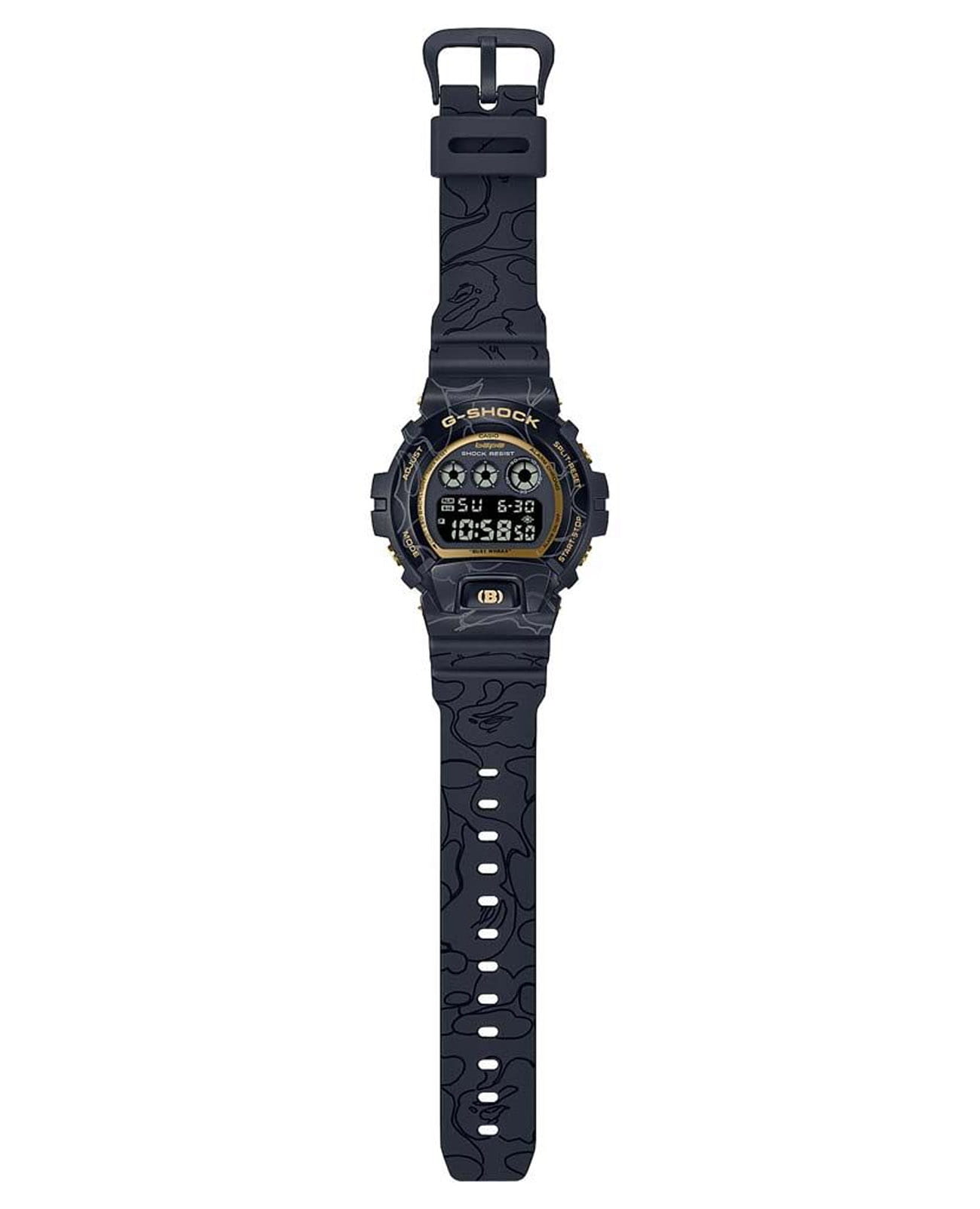 Японские мужские часы Casio G-Shock DW-6900NNJ-1ER. Эта новая специальная модель BAPE, посвященная 30-летию, является результатом сотрудничества между BATHING APE® и G-SHOCK. Компания G-SHOCK стала первопроходцем концепции надежности хронометража и постоянно совершенствует ее на протяжении 40 лет. В результате сотрудничества BAPE® и G-SHOCK GM-6900 стал первой моделью, оснащенной металлическим безелемБезельВнешний ободок, закрепляющий стекло. В спортивных часах так называется поворотное кольцо с делениями на циферблате, выполняет роль таймера – замеряет отрезки времени на шкале. Неподвижный безель – элемент декора. Однонаправленно вращающийся безель на дайверских часах позволяет фиксировать моменты погружения и выныривания на поверхность.. Корпус полностью покрыт камуфляжем BAPE®, а кольцо вокруг циферблата имеет металлическую отделку золотого цвета. На передней кнопке нанесена буква B, обозначающая BAPE®. Ударопрочный корпусУдаропрочный корпусМеханизм заключён в корпус, выполненный из современных материалов, устойчивых к ударам, механическим повреждениям и падению с высоты: инновационный пластик, карбон, нержавеющая сталь, титан. защищает механизм от ударов и вибрации. Минеральное стеклоМинеральное стеклоМинеральное стекло представляет собой искусственно выращенный минерал кварца. Такое стекло отличается особой устойчивостью к повреждениям и царапинам. Уступает по некоторым качествам сапфировому стеклу. устойчивое к появлению царапин, обладающее высокой прозрачностью. Светодиодная подсветкаСветодиодная подсветкаСветодиодная или LED-подсветка обеспечивает появление яркого холодного свечения за счёт LED-элементов - маленьких лампочек. Они потребляют минимальное количество энергии, чаще всего можно встретить 1 светодиод, в нижней части циферблата.. 12/24-часовой формат. вечный календарьВечный календарьКлассическое часовое усложнение, представляющее собой календарь, рассчитанный на несколько лет вперёд (стандартно – до 2099 года). Определяет текущую дату, день недели, месяц.. СекундомерСекундомерСекундоме́р — прибор, способный измерять интервалы времени с точностью до долей секунды.. ТаймерТаймерОтсчитывает секунды в обратном направлении в заданном интервале времени.. Часовой сигнал времени. Многофункциональный будильник. Оповещение о вспышке мигает с зуммером, который сигнализирует о тревогах, сигналах часового времени, сигнале таймера обратного отсчета времени. Класс водозащиты: 200 метров, позволит плавать, нырять и заниматься другими водными видами спорта. Ремешок из полимерного материала на стандартной застежке. В комплекте имеется сменный тканевый ремешок.
