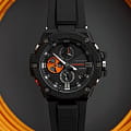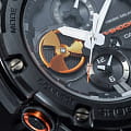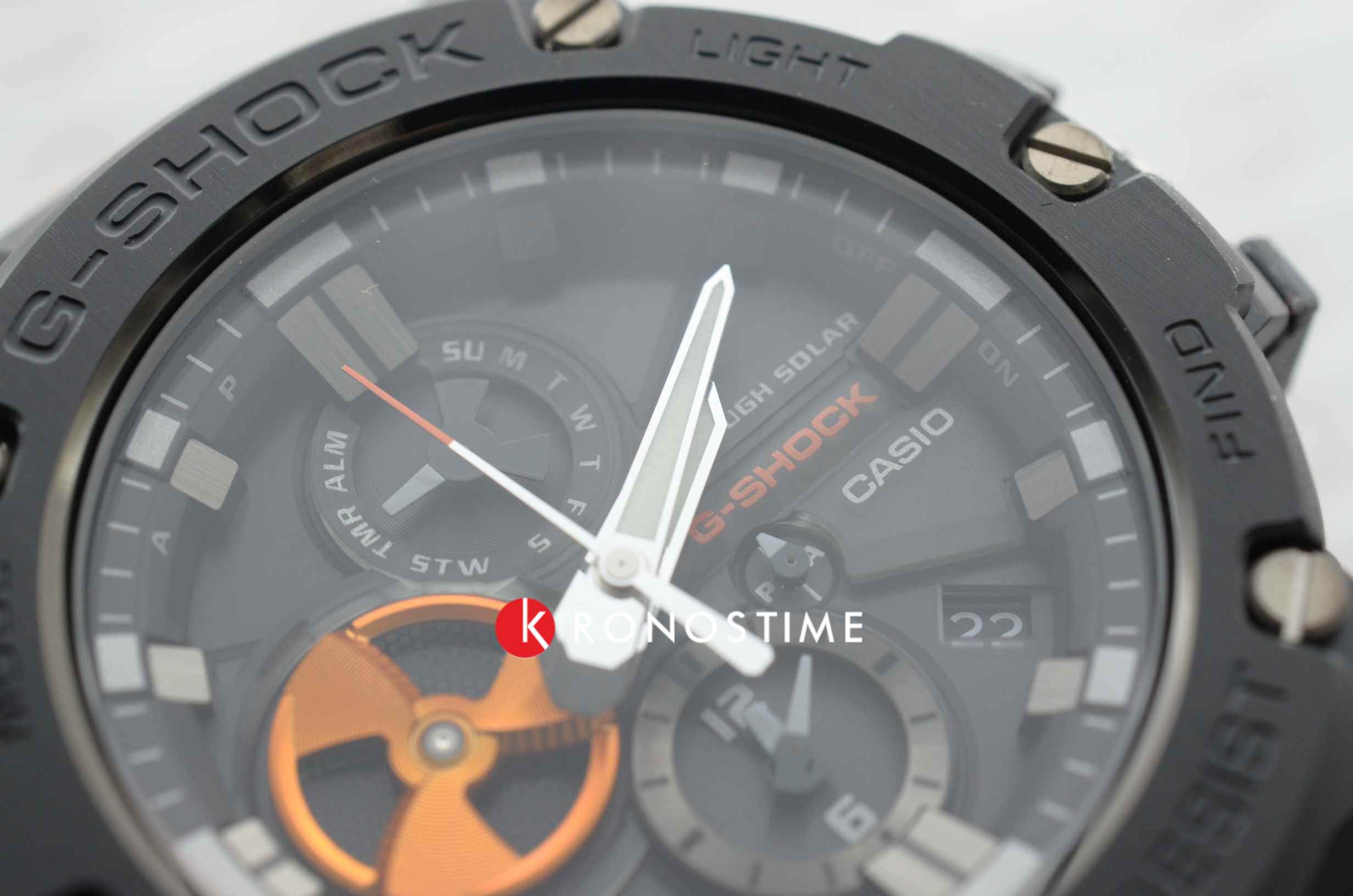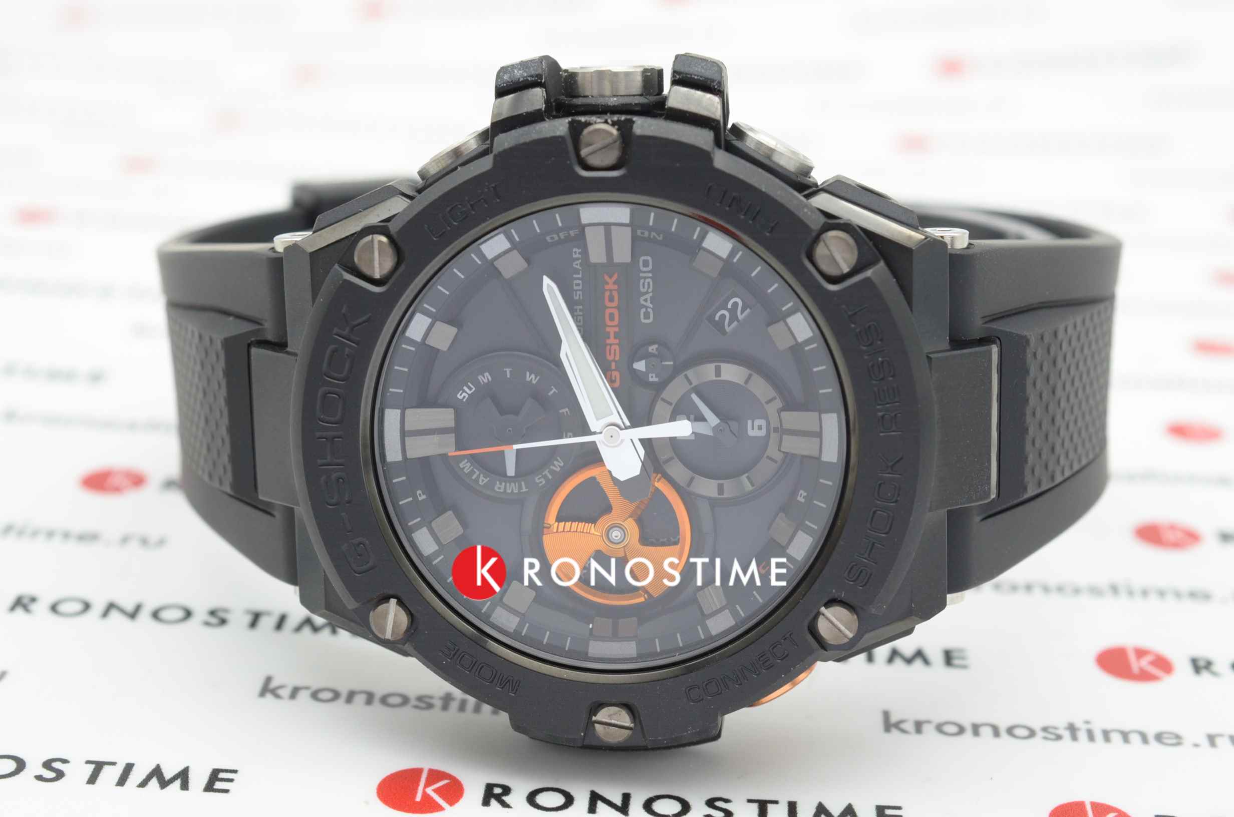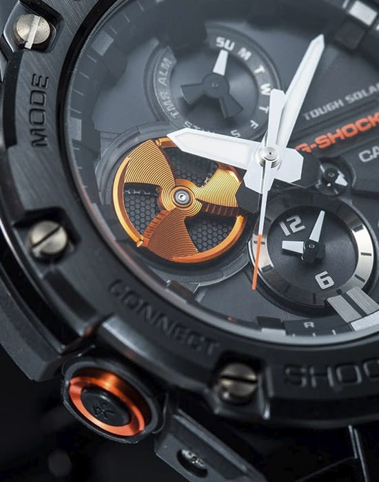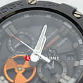 Наручные часы выпущены в брутальном, слегка агрессивном дизайне. Они оформлены в чёрном цвете, ярким элементом стал оранжевый счётчик на метке 9 часов, имитирующий турбину двигателя самолёта. Окошко предназначено для контроля уровня заряда батарейки, чем больше цвета видно, тем выше необходимость поставить часы на подзарядку. Модель серии G-Steel оснащена японским кварцевым механизмом, получаемым энергию для работы от источников света. Так реализуется технология . Аксессуар наделён противоударным корпусомУдаропрочный корпусМеханизм заключён в корпус, выполненный из современных материалов, устойчивых к ударам, механическим повреждениям и падению с высоты: инновационный пластик, карбон, нержавеющая сталь, титан. из полимера и стали 316L, что позволяет усилить конструкцию. На стрелки нанесено люминесцентное покрытиеЛюминесцентное покрытиеПозволяет считывать показания времени в темноте. Производители наносят на стрелки, часовые индексы, безель или поверхность циферблата светонакопительный состав, дающий холодное свечение., аналоговый циферблат подсвечивается светодиодомСветодиодная подсветкаСветодиодная или LED-подсветка обеспечивает появление яркого холодного свечения за счёт LED-элементов - маленьких лампочек. Они потребляют минимальное количество энергии, чаще всего можно встретить 1 светодиод, в нижней части циферблата.. Синхронизация со смартфоном BluetoothBluetoothСовременная технология, позволяющая синхронизировать часы с телефоном и переносить данные. Часы с Bluetooth расширяют возможности вашего смартфона и делают его использование ещё более удобным. позволяет устанавливать точное время, настраивать параметры будильника, мирового времениМировое время Полезное часовое усложнение, отображающее время в основных городах и известных областях по всему миру, оно связано с часовыми поясами, удобно для путешественников и бизнесменов. . Функции: ежедневный будильник, секундомер, хронографХронографФункция позволяет измерять отрезки времени с особой точностью: часы, минуты, секунды. Верным признаком хронографа является наличие на циферблате 3 дополнительных окошек-счётчиков., таймер, вечный календарьВечный календарьКлассическое часовое усложнение, представляющее собой календарь, рассчитанный на несколько лет вперёд (стандартно – до 2099 года). Определяет текущую дату, день недели, месяц.. Габариты: 58,1 x 53,8 x 14,1 мм.