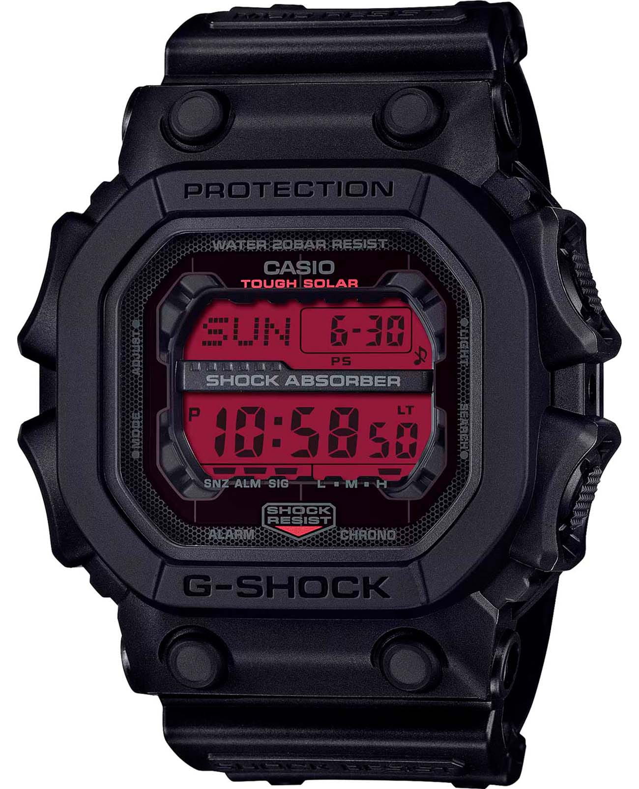Мужские кварцевые часы Casio из коллекции G-Shock — это прочный и технологичный аксессуар для активного образа жизни. Корпус размером 53,6 мм и толщиной 17,5 мм выполнен из пластика. Циферблат красного цвета защищён минеральным стекломМинеральное стеклоМинеральное стекло представляет собой искусственно выращенный минерал кварца. Такое стекло отличается особой устойчивостью к повреждениям и царапинам. Уступает по некоторым качествам сапфировому стеклу.. Модель оснащена системой питания от солнечной энергии Tough SolarTough SolarТехнология основана на подзарядке аккумулятора от источника солнечного света, специальная панель улавливает солнечные лучи и преобразует их в энергию для работы часов. Достаточно пары минут нахождения на солнце для функционирования часов в течении суток., которая обеспечивает до 13 месяцев автономной работы без подзарядки, а в режиме энергосбережения — до 27 месяцев. Индикатор заряда батареи позволяет контролировать уровень энергии. Функция автоматического сохранения энергии отключает дисплей при длительном отсутствии действий. Подсветка — светодиоднаяСветодиодная подсветкаСветодиодная или LED-подсветка обеспечивает появление яркого холодного свечения за счёт LED-элементов - маленьких лампочек. Они потребляют минимальное количество энергии, чаще всего можно встретить 1 светодиод, в нижней части циферблата., белого цвета, с настраиваемым послесвечиванием (1,5 или 3 секунды). Часы оснащены функциями хронографаХронографФункция позволяет измерять отрезки времени с особой точностью: часы, минуты, секунды. Верным признаком хронографа является наличие на циферблате 3 дополнительных окошек-счётчиков., SPLIT-режимомСплит-хронографИспользуется для измерения продолжительности нескольких временных отрезков, начинающихся одновременно, а заканчивающихся в разное время., таймера обратного отсчётаТаймерОтсчитывает секунды в обратном направлении в заданном интервале времени. (от 1 минуты до 24 часов) и мирового времениМировое время Полезное часовое усложнение, отображающее время в основных городах и известных областях по всему миру, оно связано с часовыми поясами, удобно для путешественников и бизнесменов. — 38 городов (31 часовой пояс), поддержка UTC и летнего времени. Также присутствуют 5 будильников, ежечасный сигнал и возможность включения/отключения звука. Календарь — автоматический (до 2099 года). Противоударная конструкция защищает механизм от ударов и вибрацииУдаропрочный корпусМеханизм заключён в корпус, выполненный из современных материалов, устойчивых к ударам, механическим повреждениям и падению с высоты: инновационный пластик, карбон, нержавеющая сталь, титан., а также предотвращает попадание пыли и грязи внутрь корпуса. Стальная задняя крышка крепится на 4 винта. Часы оснащены пластиковым ремешком с классической пряжкой. Водонепроницаемость 200 м позволяет использовать часы для плавания и дайвинга. Идеальный выбор для тех, кто ценит надёжность, технологии и экстремальные условия.