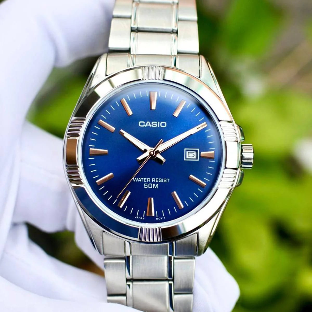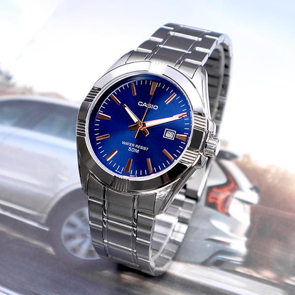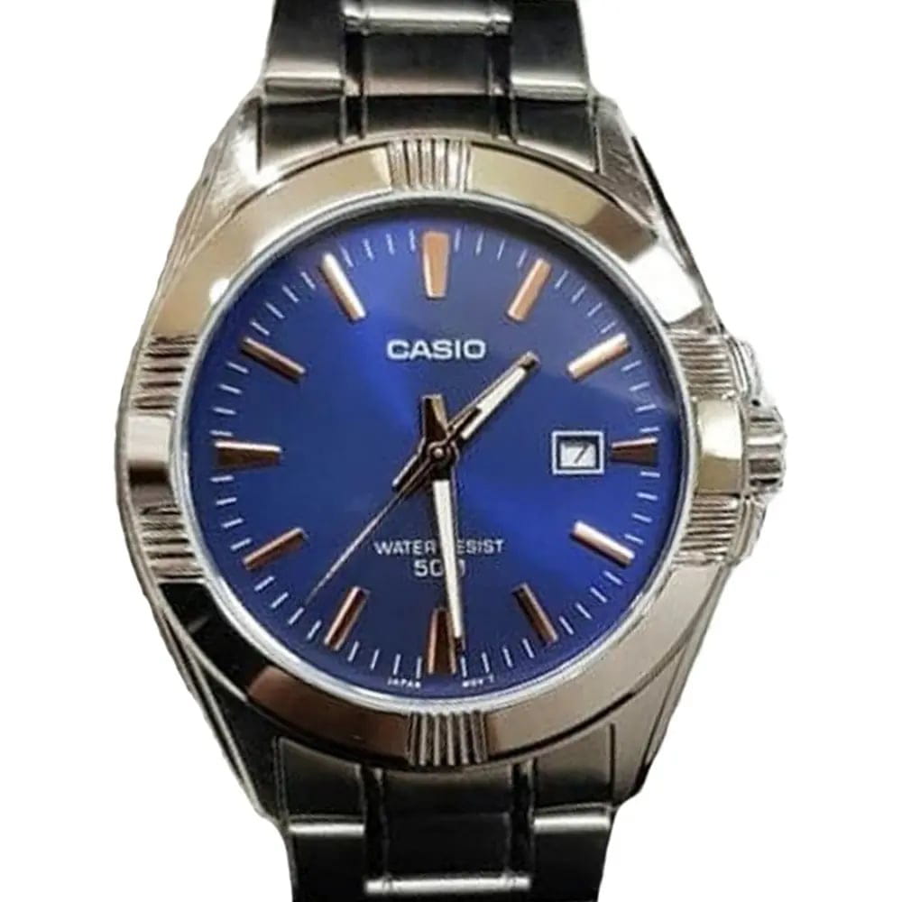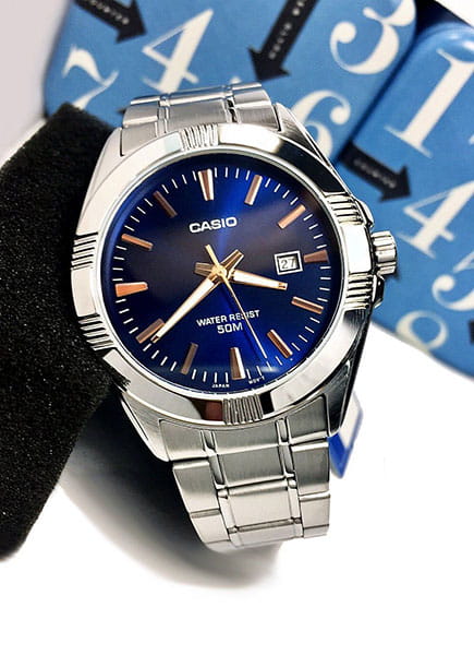 Японские мужские часы с минеральным стекломМинеральное стеклоМинеральное стекло представляет собой искусственно выращенный минерал кварца. Такое стекло отличается особой устойчивостью к повреждениям и царапинам. Уступает по некоторым качествам сапфировому стеклу. Casio MTP-1308D-2A, кварцевый механизм с высокой точностью. Класс водозащиты: 50 метров, позволит защитить корпус от случайных брызг или капель дождя. Корпус часов изготовлен из стали. Стальной браслет на раскладной застёжкеРаскладная застёжкаТакой тип застёжки используется только на браслетах из металла. Она никогда не раскрывается полностью, происходит разделение на 2 и более частей. Раскладывающая застёжка снизит вероятность потери часов к минимуму.. Стрелки с люминесцентным покрытиемЛюминесцентное покрытиеПозволяет считывать показания времени в темноте. Производители наносят на стрелки, часовые индексы, безель или поверхность циферблата светонакопительный состав, дающий холодное свечение.. Окошко даты находится в положении 3 часа. Заводная головка с защитой.
